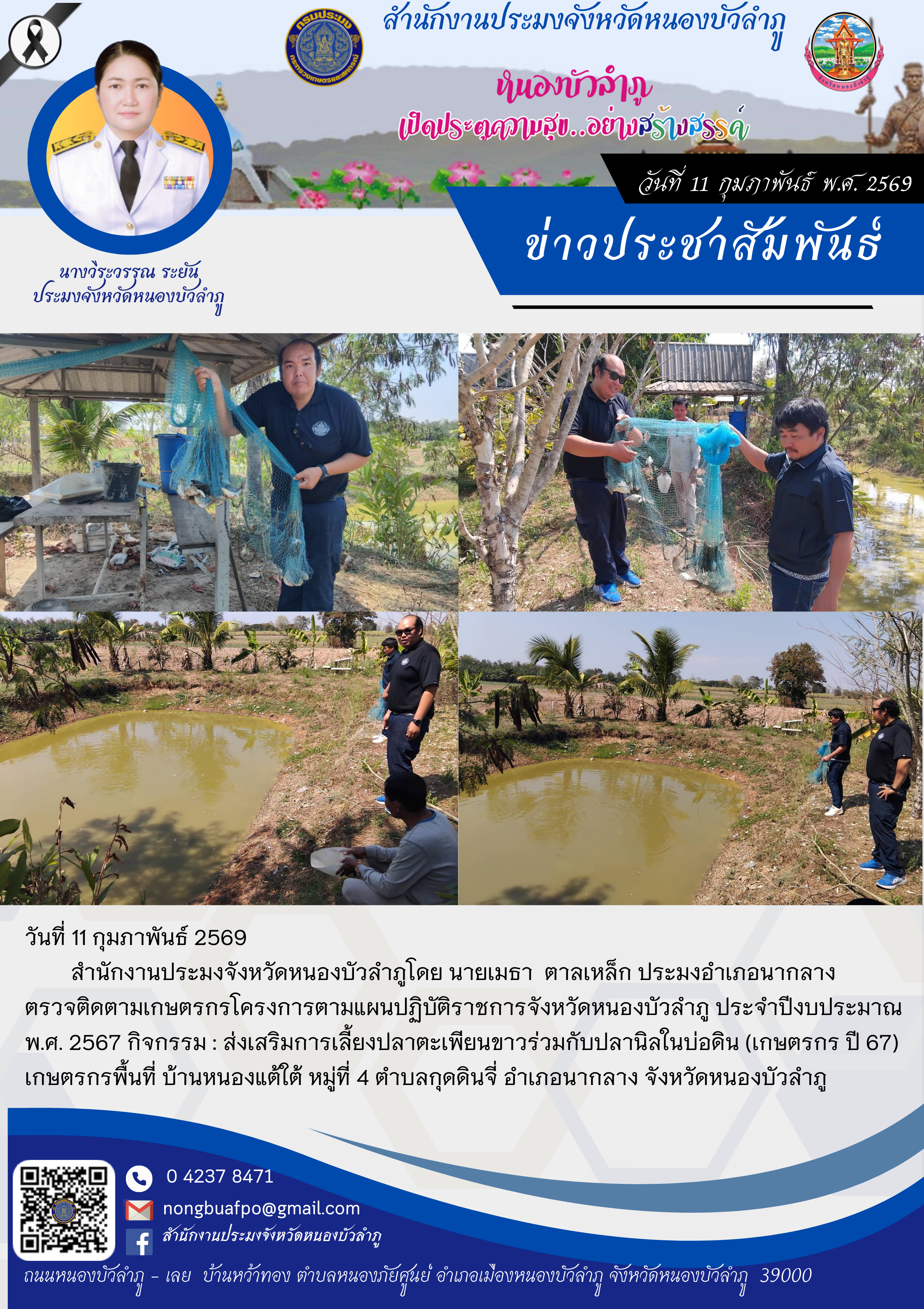 [2026-02-13] ร่วมอบรมโครงการฝึกอบรมหลักสูตร การเสริมสร้างองค์กรแห่งความสุขเพื่อสร้า.. [2026-02-13] ประมงจังหวัดหนองบัวลำภู เป็นประธานในกิจกรรมส่งมอบพันธุ์ปลากินพืช ครั้ง.. [2026-02-13] ลงพื้นที่ปฏิบัติงานคัดลือกเกษตรกรเพื่อเข้าร่วมโครงการตามแผนปฏิบัติราชก.. [2026-02-13] ร่วมกิจกรรมงานรณรงค์ “Green Gain Day สร้างการเรียนรู้และสร้างแรงจูงใจ.. [2026-02-13] เข้าร่วมประชุมเตรียมความพร้อม การออกหน่วยบริการตามโครงการ “หน่วยบำบัด.. [2026-02-13] ร่วมประชุมชี้แจงแนวทางการตรวจราชการของเขตตรวจราชการที่ 10 ผ่านระบบการ.. [2026-02-13] ร่วมกิจกรรม Green Gain Day สร้างการเรียนรู้และสร้างแรงจูงใจ “ไม่เผาแต.. [2026-02-12] ตรวจติดตามเกษตรกรโครงการตามแผนปฏิบัติราชการจังหวัดหนองบัวลำภู ประจำปีง.. [2026-02-12] การให้ความช่วยเหลือเกษตรกรที่ประสบภัยพิบัติ.. [2026-02-11] คำสั่งจังหวัดหนองบัวลำภู เรื่อง แต่งตั้งกรรมการผู้ทรงคุณวุฒิในคณะกรรมก.. อ่านทั้งหมด