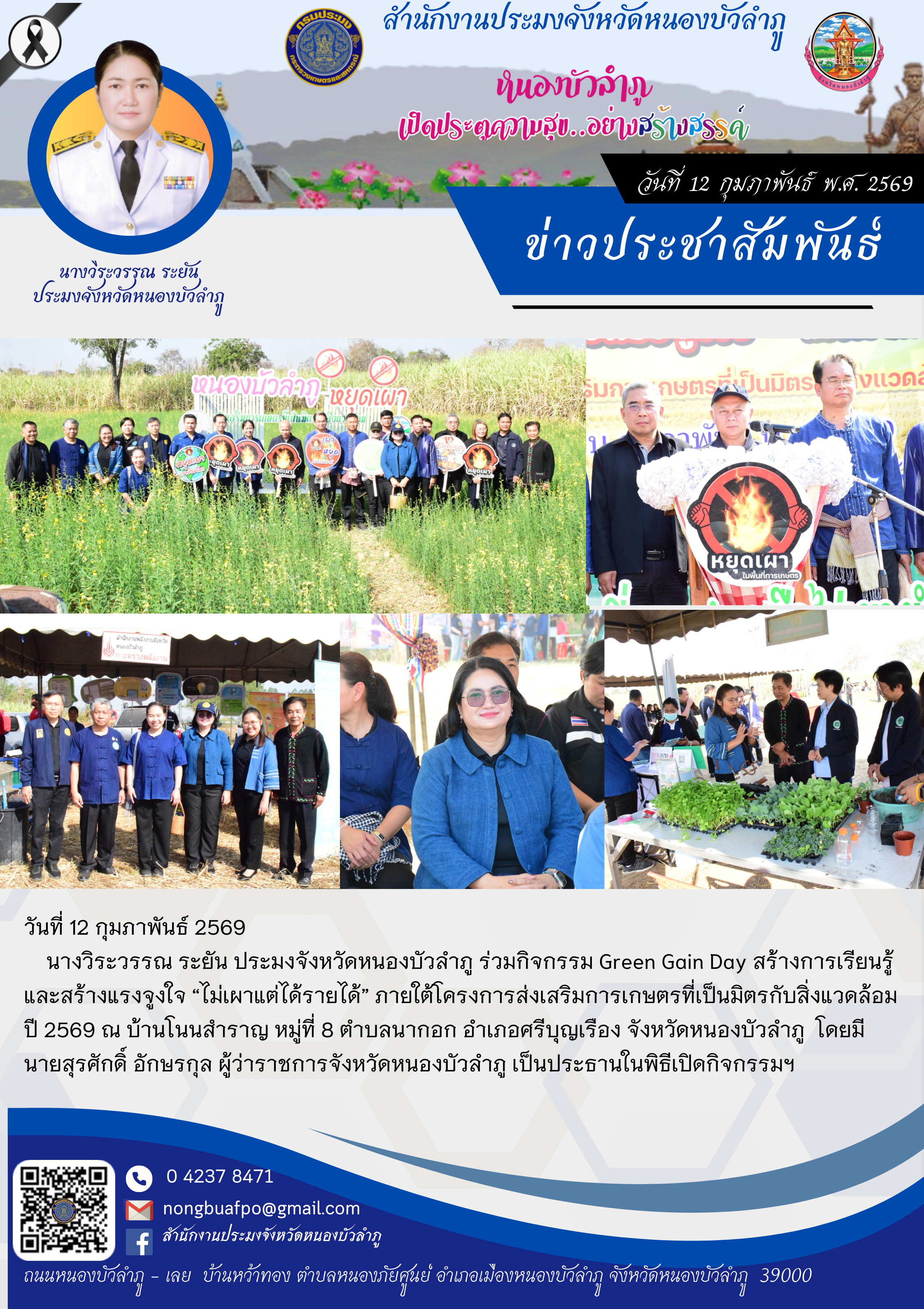 นางวิระวรรณ ระยัน ประมงจังหวัดหนองบัวลำภู ร่วมกิจกรรม Green Gain Day สร้างการเรียนรู้และสร้างแรงจูงใจ “ไม่เผาแต่ได้รายได้” ภายใต้โครงการส่งเสริมการเกษตรที่เป็นมิตรกับสิ่งแวดล้อม ปี 2569 ณ บ้านโนนสำราญ หมู่ที่ 8 ตำบลนากอก อำเภอศรีบุญเรือง จังหวัดหนองบัวลำภู โดยมี นายสุรศักดิ์ อักษรกุล ผู้ว่าราชการจังหวัดหนองบัวลำภู เป็นประธานในพิธีเปิดกิจกรรมฯ