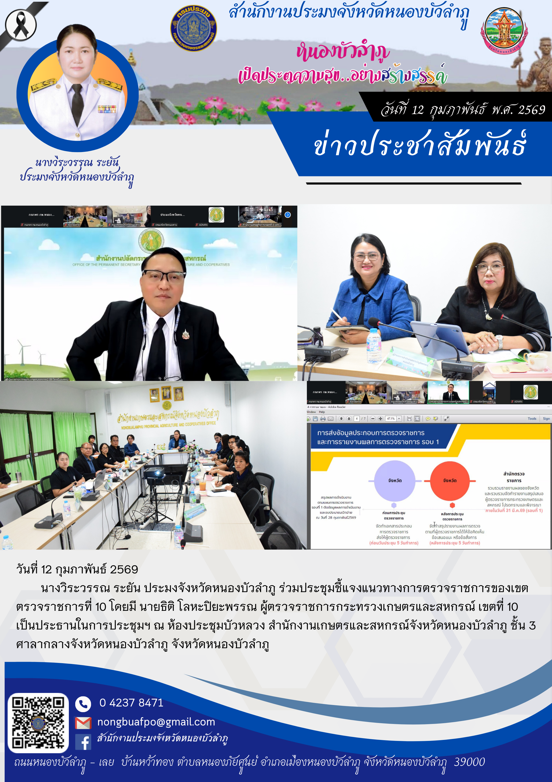 นางวิระวรรณ ระยัน ประมงจังหวัดหนองบัวลำภู ร่วมประชุมชี้แจงแนวทางการตรวจราชการของเขตตรวจราชการที่ 10 ผ่านระบบการประชุมทางไกล Zoom Meeting ณ ห้องประชุมบัวหลวง สำนักงานเกษตรและสหกรณ์จังหวัดหนองบัวลำภู ชั้น 3 ศาลากลางจังหวัดหนองบัวลำภู จังหวัดหนองบัวลำภู โดยมี นายธิติ โลหะปิยะพรรณ ผู้ตรวจราชการกระทรวงเกษตรและสหกรณ์ เขตที่ 10 เป็นประธานในการประชุมฯ
