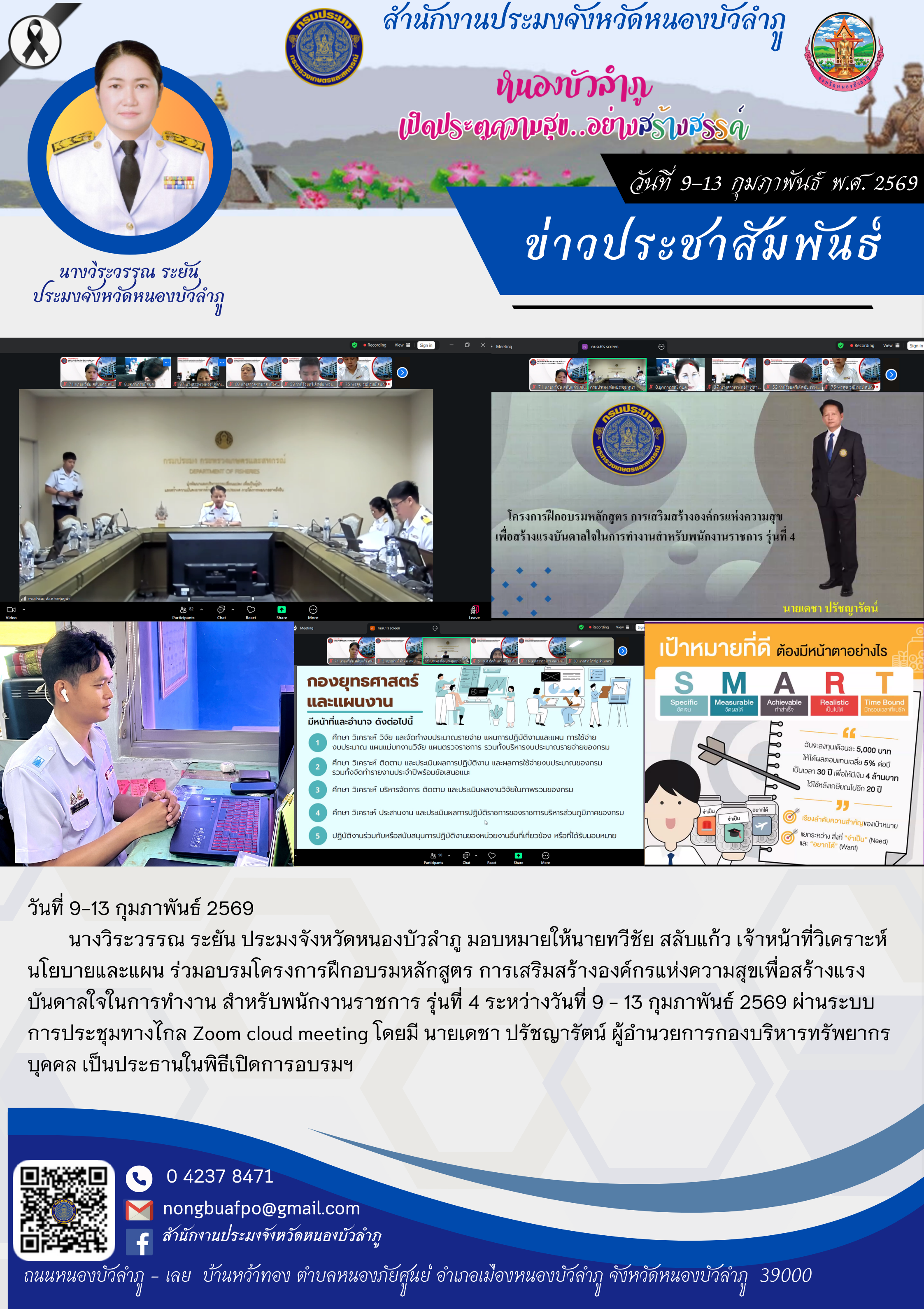 นางวิระวรรณ ระยัน ประมงจังหวัดหนองบัวลำภู มอบหมายให้นายทวีชัย สลับแก้ว เจ้าหน้าที่วิเคราะห์นโยบายและแผน ร่วมอบรมโครงการฝึกอบรมหลักสูตร การเสริมสร้างองค์กรแห่งความสุขเพื่อสร้างแรงบันดาลใจในการทำงาน สำหรับพนักงานราชการ รุ่นที่ 4 ระหว่างวันที่ 9 - 13 กุมภาพันธ์ 2569 ผ่านระบบการประชุมทางไกล Zoom cloud meeting โดยมี นายเดชา ปรัชญารัตน์ ผู้อำนวยการกองบริหารทรัพยากรบุคคล เป็นประธานในพิธีเปิดการอบรมฯ