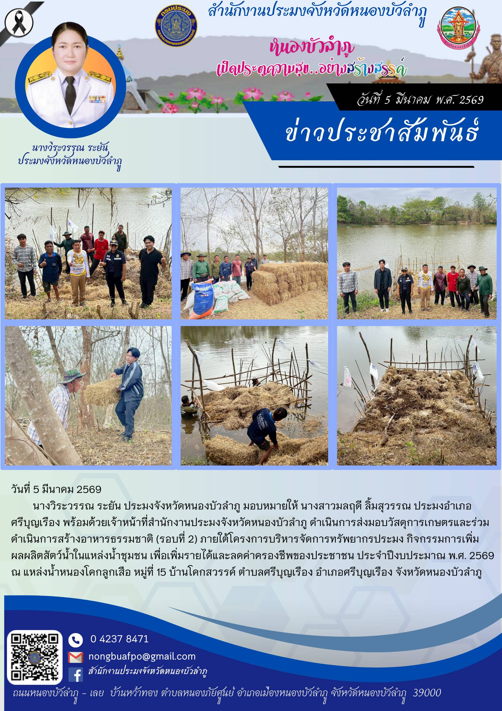 นางวิระวรรณ ระยัน ประมงจังหวัดหนองบัวลำภู มอบหมายให้ นางสาวมลฤดี ลิ้มสุวรรณ ประมงอำเภอศรีบุญเรือง พร้อมด้วยเจ้าหน้าที่สำนักงานประมงจังหวัดหนองบัวลำภู ดำเนินการส่งมอบวัสดุการเกษตรและร่วมดำเนินการสร้างอาหารธรรมชาติ (รอบที่ 2) ภายใต้โครงการบริหารจัดการทรัพยากรประมง กิจกรรมการเพิ่มผลผลิตสัตว์น้ำในแหล่งน้ำชุมชน เพื่อเพิ่มรายได้และลดค่าครองชีพของประชาชน ประจำปีงบประมาณ พ.ศ. 2569 ณ แหล่งน้ำหนองโคกลูกเสือ หมู่ที่ 15 บ้านโคกสวรรค์ ตำบลศรีบุญเรือง อำเภอศรีบุญเรือง จังหวัดหนองบัวลำภู