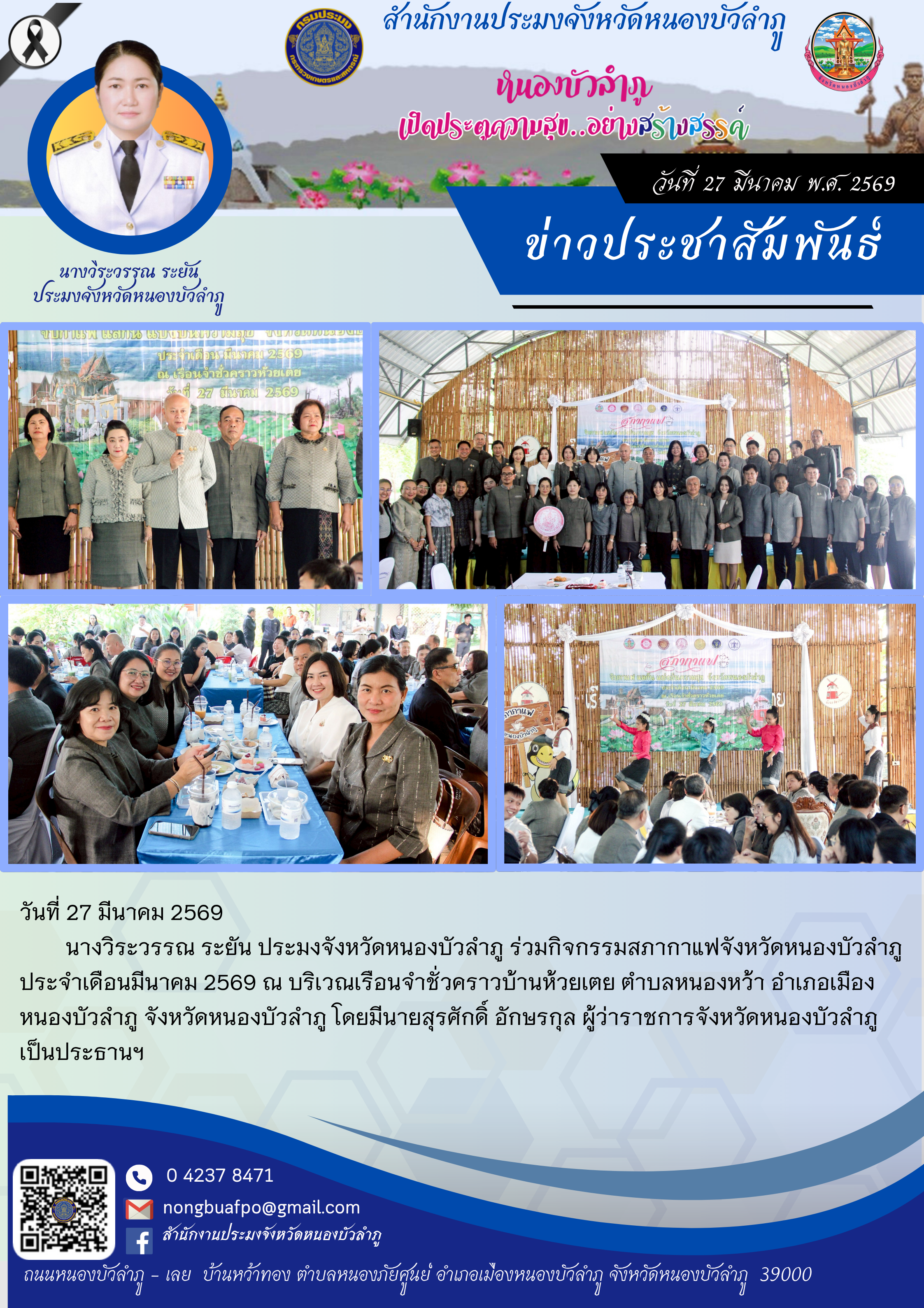 นางวิระวรรณ ระยัน ประมงจังหวัดหนองบัวลำภู ร่วมกิจกรรมสภากาแฟจังหวัดหนองบัวลำภู ประจำเดือนมีนาคม 2569 ณ บริเวณเรือนจำชั่วคราวบ้านห้วยเตย ตำบลหนองหว้า อำเภอเมืองหนองบัวลำภู จังหวัดหนองบัวลำภู โดยมีนายสุรศักดิ์ อักษรกุล ผู้ว่าราชการจังหวัดหนองบัวลำภู เป็นประธานฯ