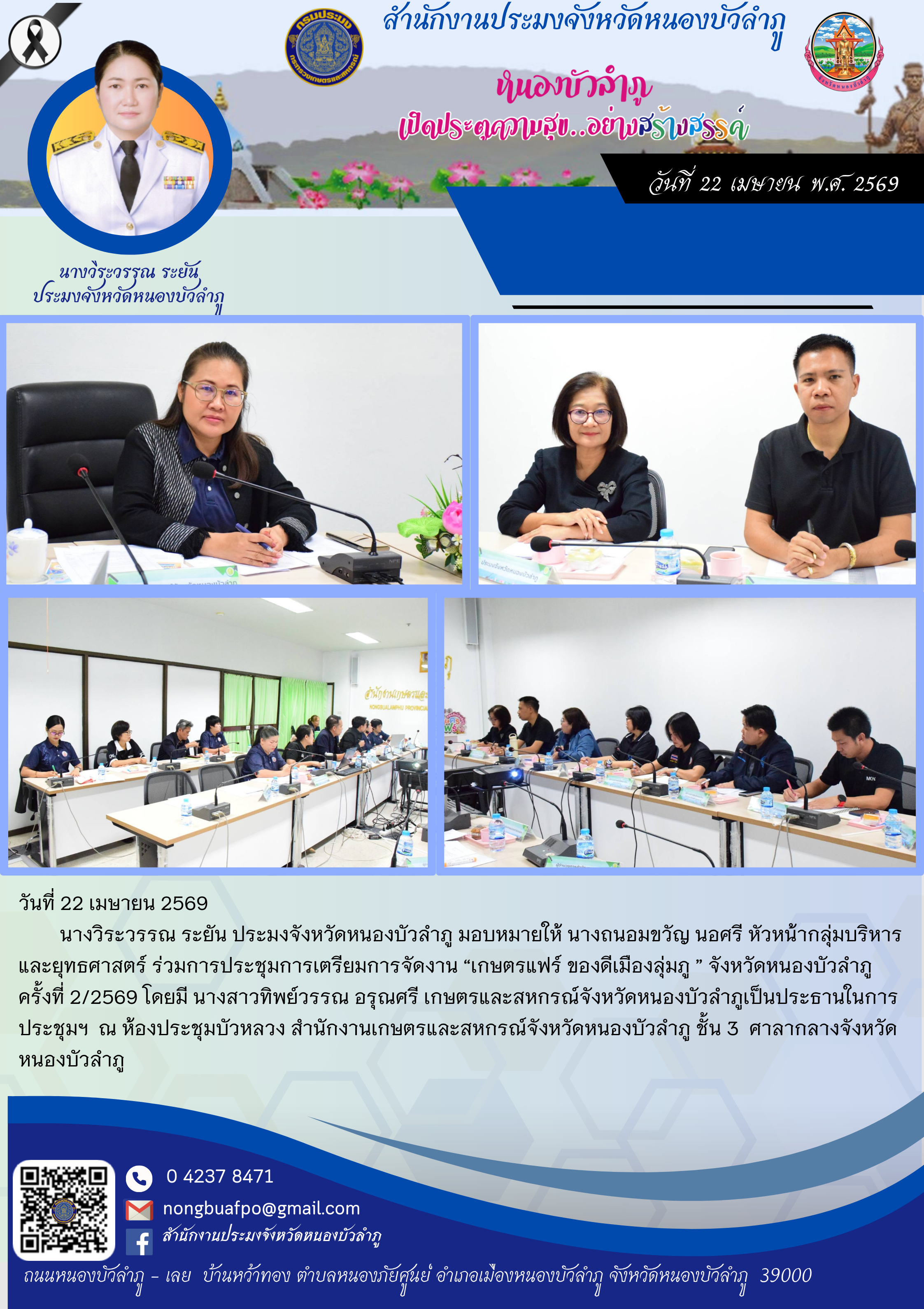 นางวิระวรรณ ระยัน ประมงจังหวัดหนองบัวลำภู มอบหมายให้ นางถนอมขวัญ นอศรี หัวหน้ากลุ่มบริหารและยุทธศาสตร์ ร่วมการประชุมการเตรียมการจัดงาน “เกษตรแฟร์ ของดีเมืองลุ่มภู ” จังหวัดหนองบัวลำภู ครั้งที่ 2/2569 โดยมี นางสาวทิพย์วรรณ อรุณศรี เกษตรและสหกรณ์จังหวัดหนองบัวลำภูเป็นประธานในการประชุมฯ ณ ห้องประชุมบัวหลวง สำนักงานเกษตรและสหกรณ์จังหวัดหนองบัวลำภู ชั้น 3 ศาลากลางจังหวัดหนองบัวลำภู