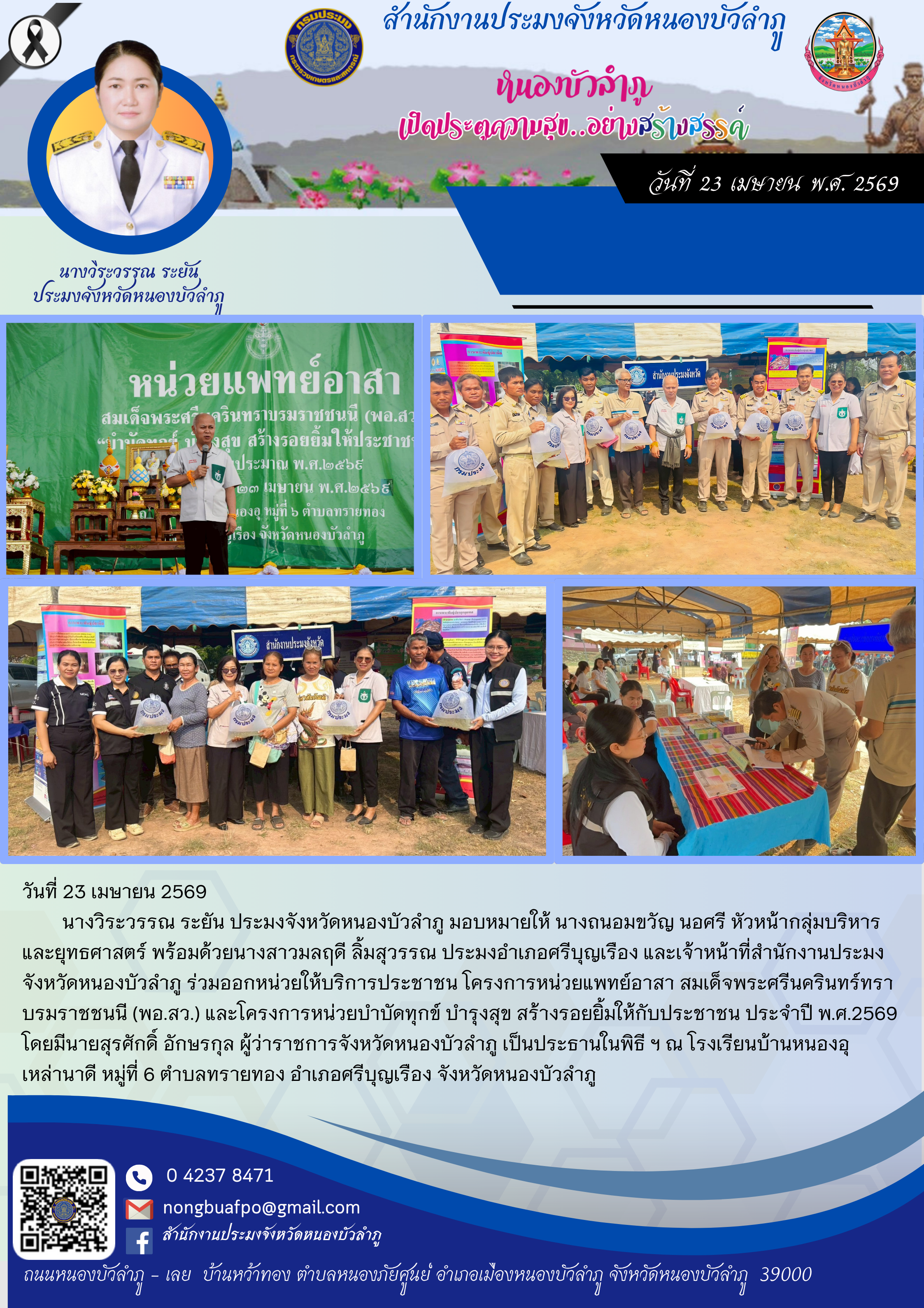 นางวิระวรรณ ระยัน ประมงจังหวัดหนองบัวลำภู มอบหมายให้ นางถนอมขวัญ นอศรี หัวหน้ากลุ่มบริหารและยุทธศาสตร์ พร้อมด้วยนางสาวมลฤดี ลิ้มสุวรรณ ประมงอำเภอศรีบุญเรือง และเจ้าหน้าที่สำนักงานประมงจังหวัดหนองบัวลำภู ร่วมออกหน่วยให้บริการประชาชน โครงการหน่วยแพทย์อาสา สมเด็จพระศรีนครินทร์ทรา บรมราชชนนี (พอ.สว.) และโครงการหน่วยบำบัดทุกข์ บำรุงสุข สร้างรอยยิ้มให้กับประชาชน ประจำปี พ.ศ.2569 โดยมีนายสุรศักดิ์ อักษรกุล ผู้ว่าราชการจังหวัดหนองบัวลำภู เป็นประธานในพิธี ฯ ณ โรงเรียนบ้านหนองอุ เหล่านาดี หมู่ที่ 6 ตำบลทรายทอง อำเภอศรีบุญเรือง จังหวัดหนองบัวลำภู