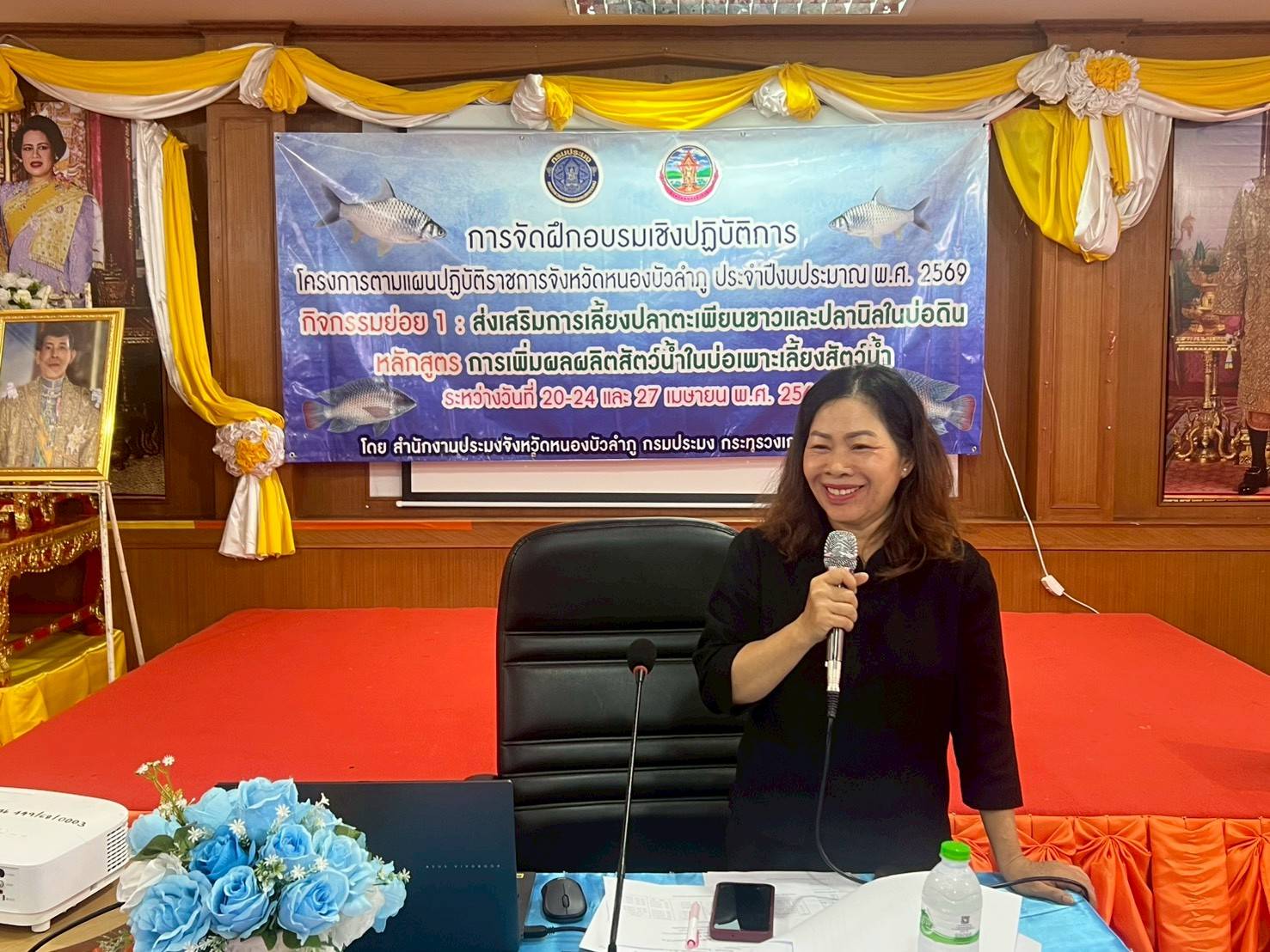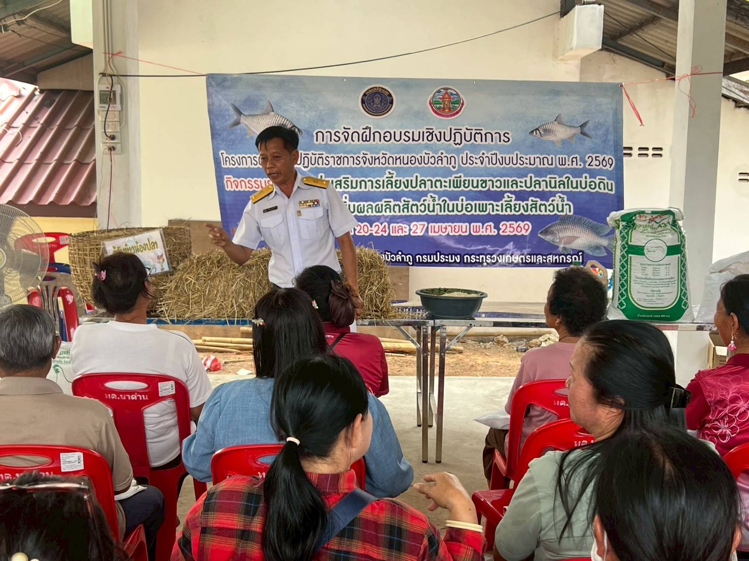 นางวิระวรรณ ระยัน ประมงจังหวัดหนองบัวลำภู มอบหมายให้ นางสาวทัศนีย์ สุนนท์ชัย หัวหน้ากลุ่มพัฒนาและส่งเสริมอาชีพการประมง พร้อมด้วย นายสมมิตร ธรรมมิยะ ประมงอำเภอสุวรรณคูหา นายเมธา ตาลเหล็ก ประมงอำเภอนากลาง นายเทียรชัย ซินโซ ประมงอำเภอเมืองหนองบัวลำภู นางสาวมลฤดี ลิ้มสุวรรณ ประมงอำเภอศรีบุญเรือง นางสาวดาพร หนันทะ เจ้าพนักงานประมงชำนาญงาน รักษาราชการแทนประมงอำเภอโนนสัง และเจ้าหน้าที่กลุ่มพัฒนาและส่งเสริมอาชีพการประมง สำนักงานประมงจังหวัดหนองบัวลำภู ดำเนินงานจัดฝึกอบรมเชิงปฏิบัติการให้แก่เกษตรกรที่เข้าร่วมโครงการตามแผนปฏิบัติราชการประจำปีของจังหวัดหนองบัวลำภู ประจำปีงบประมาณ พ.ศ. 2569 โครงการยกระดับการผลิตด้านประมง กิจกรรมหลัก : ส่งเสริมการเลี้ยงปลาตะเพียนขาวและปลานิลในบ่อดิน กิจกรรมย่อย : ส่งเสริมการเลี้ยงปลาตะเพียนขาวและปลานิลในบ่อดิน ในพื้นที่ อำเภอสุวรรณคูหา จำนวน 25 ราย อำเภอนากลางจำนวน 25 ราย อำเภอเมืองหนองบัวลำภู จำนวน 25 ราย อำเภอนาวังจำนวน 25 ราย อำเภอโนนสัง จำนวน 23 ราย และอำเภอศรีบุญเรือง จำนวน 27 ราย รวมทั้งสิ้น 150 ราย โดยมีเจ้าหน้าที่จากสำนักงานตรวจบัญชีสหกรณ์หนองบัวลำภู และวิทยากรจากกลุ่มแปรรูปปลาบ้านห้วยบง ตรา 1 เดียว ร่วมเป็นวิทยากรในการฝึกอบรมฯ ในครั้งนี้