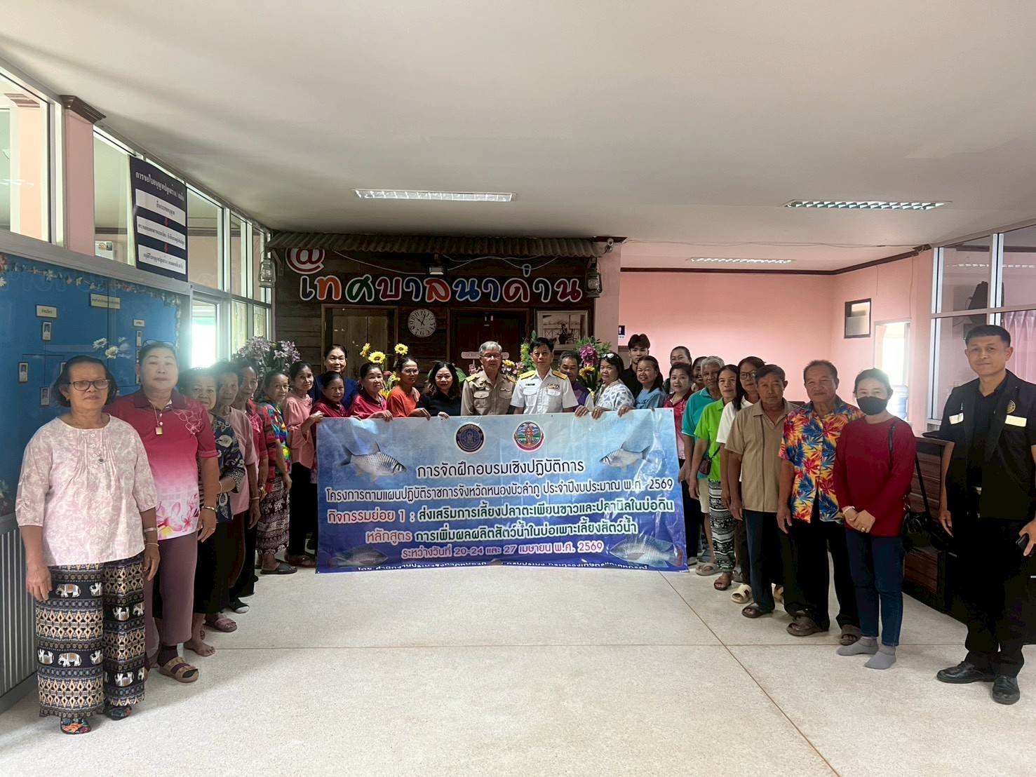 ดำเนินงานจัดฝึกอบรมเชิงปฏิบัติการให้แก่เกษตรกรที่เข้าร่วมโครงการตามแผนปฏิบัติราชการประจำปีของจังหวัดหนองบัวลำภู ประจำปีงบประมาณ พ.ศ. 2569 โครงการยกระดับการผลิตด้านประมง กิจกรรมหลัก : ส่งเสริมการเลี้ยงปลาตะเพียนขาวและปลานิลในบ่อดิน กิจกรรมย่อย : ส่งเสริมการเลี้ยงปลาตะเพียนขาวและปลานิลในบ่อดิน