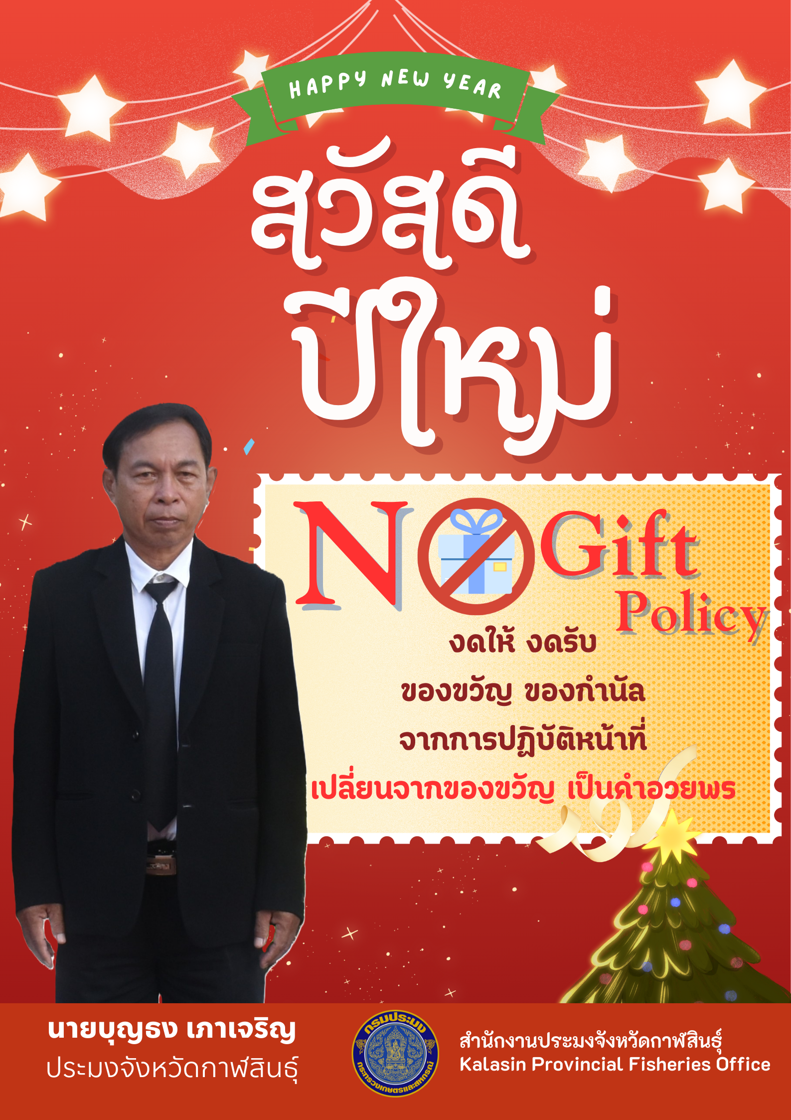 นายบุญธง เภาเจริญ ประมงจังหวัดกาฬสินธุ์ ขอประกาศเจตนารมณ์ ไม่รับของขวัญและของกำนัลทุกชนิดจากการปฏิบัติหน้าที่ เพื่อเสริมสร้างค่านิยมด้านความซื่อสัตย์สุจริต ความประหยัด สร้างทัศนคติที่ถูกต้อง และป้องกันการเกิดผลประโยชน์ทับซ้อน อันอาจนำไปสู่การทุจริตในภาครัฐขอประกาศเจตนารมณ์ ไม่รับของขวัญและของกำนัลทุกชนิดจากการปฏิบัติหน้าที่ เพื่อเสริมสร้างค่านิยมด้านความซื่อสัตย์สุจริต ความประหยัด สร้างทัศนคติที่ถูกต้อง และป้องกันการเกิดผลประโยชน์ทับซ้อน อันอาจนำไปสู่การทุจริตในภาครัฐ