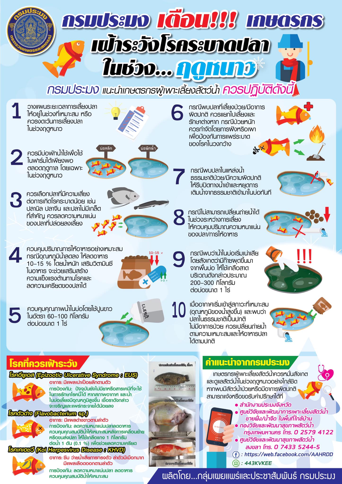 ทั้งนี้ เกษตรกรผู้เพาะเลี้ยงสัตว์น้ำควรหมั่นสังเกตและดูแลสัตว์น้ำในช่วงฤดูหนาวอย่างใกล้ชิด หากพบมีสัตว์น้ำป่วยหรือมีอาการผิดปกติ สามารถแจ้งหรือขอรับคำปรึกษาได้ที่ สำนักงานประมงจังหวัดหรือศูนย์วิจัยและพัฒนาการเพาะเลี้ยงสัตว์น้ำน้ำจืดในพื้นที่ใกล้บ้าน