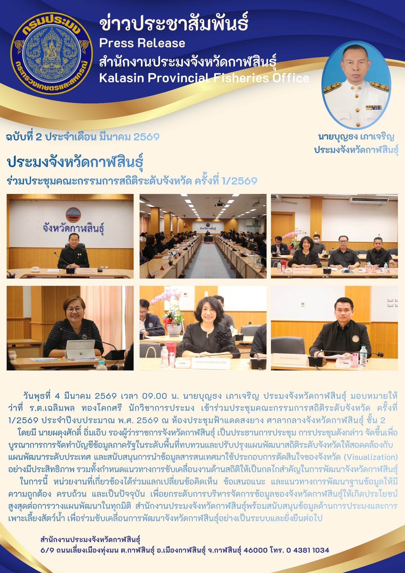วันพุธที่ 4 มีนาคม 2569 เวลา 09.00 น. นายบุญธง เภาเจริญ ประมงจังหวัดกาฬสินธุ์ มอบหมายให้ ว่าที่ ร.ต.เฉลิมพล ทองโคกศรี นักวิชาการประมง เข้าร่วมประชุมคณะกรรมการสถิติระดับจังหวัด ครั้งที่ 1/2569 ประจำปีงบประมาณ พ.ศ. 2569 ณ ห้องประชุมฟ้าแดดสงยาง ศาลากลางจังหวัดกาฬสินธุ์ ชั้น 2