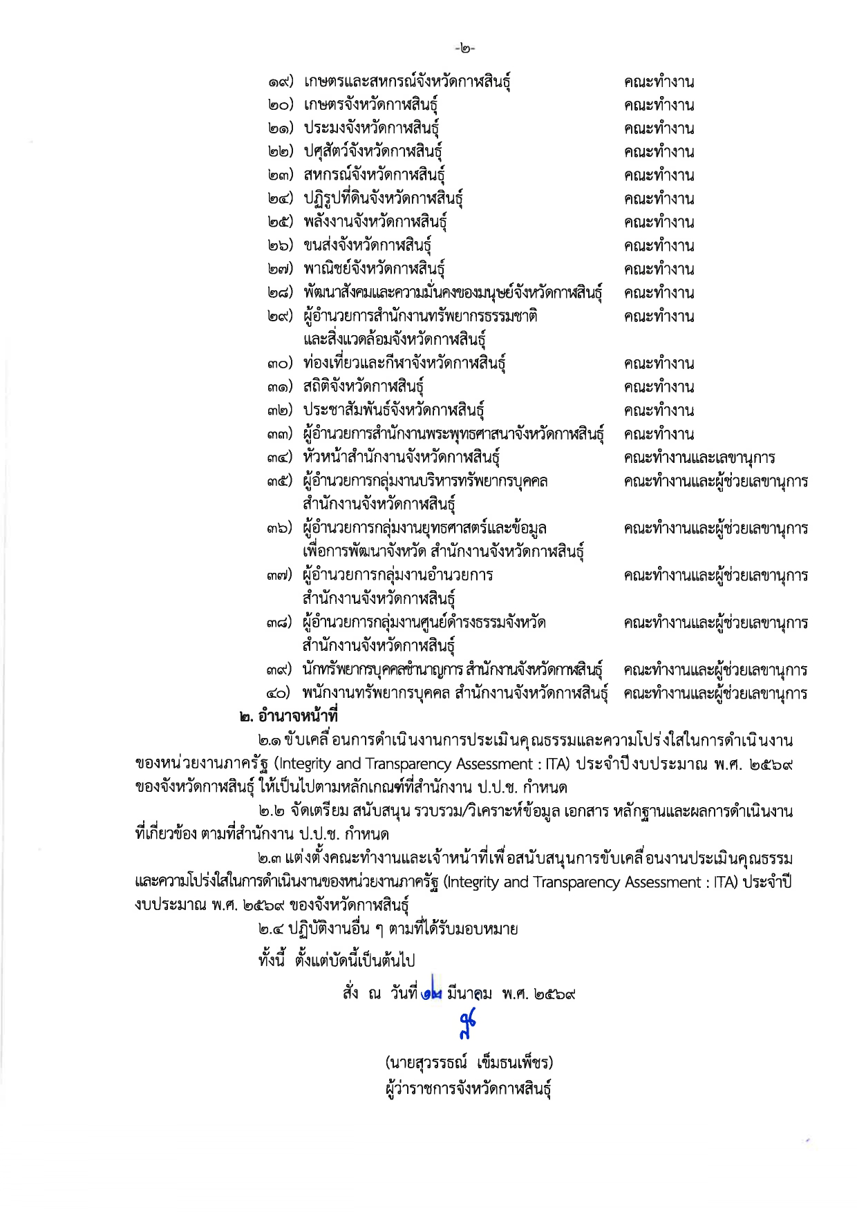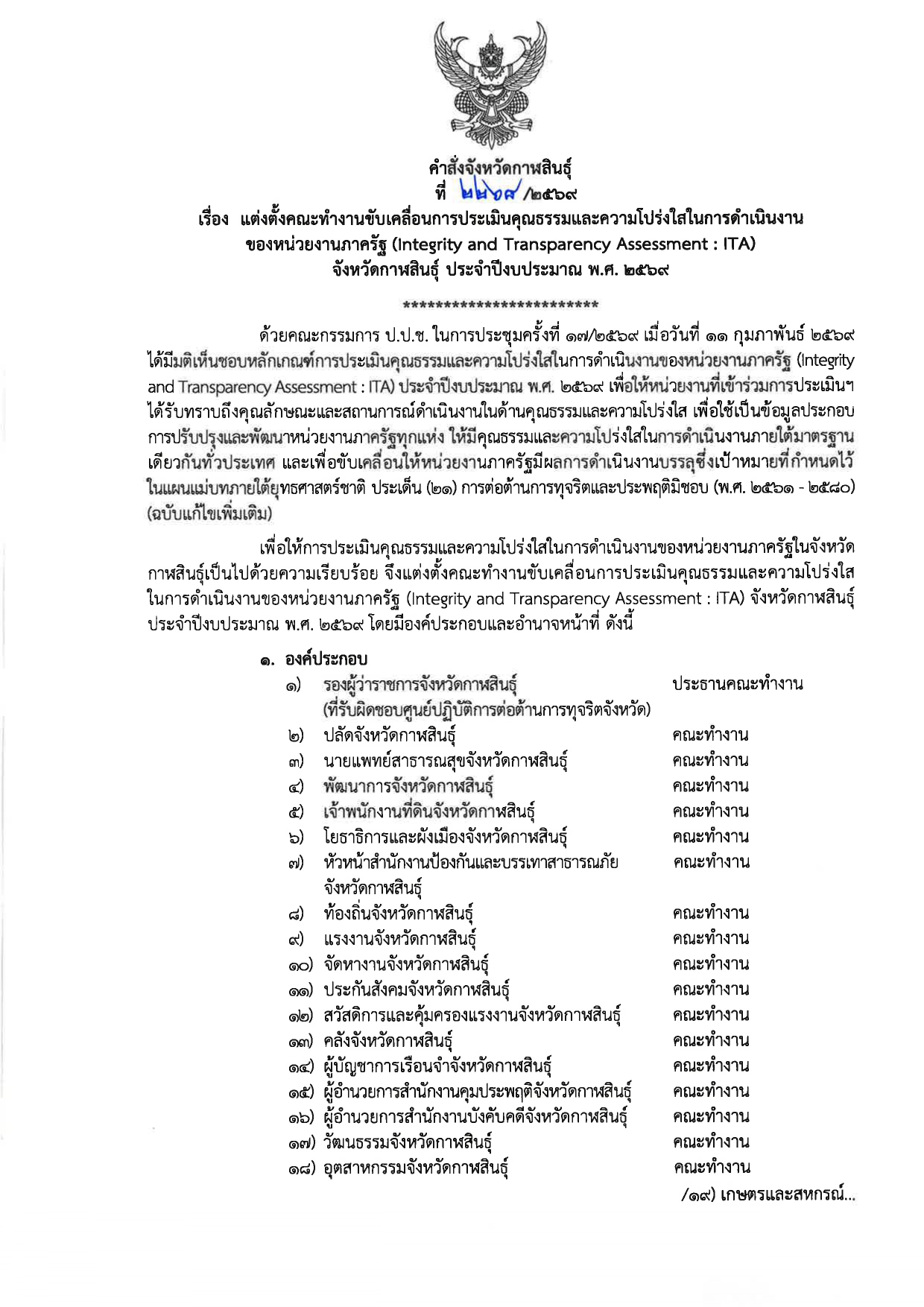 คำสั่งจังหวัดกาฬสินธุ์ ที่ 2268/2569 เรื่อง แต่งตั้งคณะทำงานขับเคลื่อนการประเมินคุณธรรมและความโปร่งใสในการดำเนินงานของหน่วยงานภาครัฐ (Integrity an Transparency Assessment : ITA) จังหวัดกาฬสินธุ์ ประจำปีงบประมาณ พ.ศ. 2569