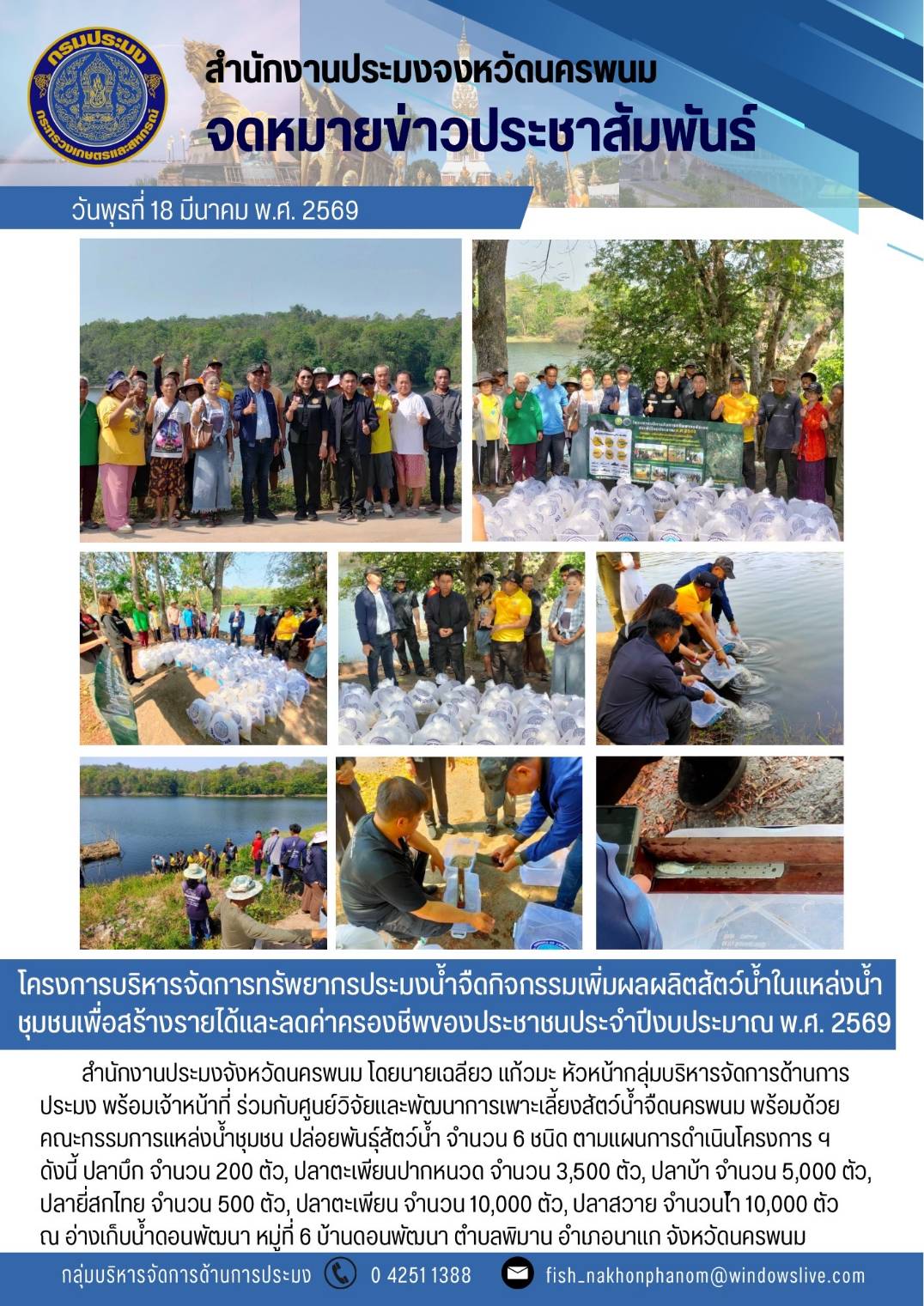 สำนักงานประมงจังหวัดนครพนม โดยนายเฉลียว แก้วมะ หัวหน้ากลุ่มบริหารจัดการด้านการประมง พร้อมเจ้าหน้าที่ ร่วมกับศูนย์วิจัยและพัฒนาการเพาะเลี้ยงสัตว์น้ำจืดนครพนม พร้อมด้วยคณะกรรมการแหล่งน้ำชุมชน ปล่อยพันธุ์สัตว์น้ำ จำนวน 6 ชนิด ตามแผนการดำเนินโครงการ ฯ ดังนี้