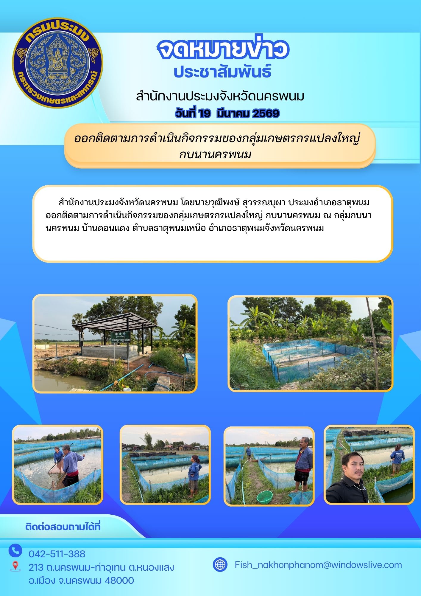 [2026-03-20] โครงการจังหวัดเคลื่อนที่แบบบูรณาการ หน่วยบำบัดทุกข์ บำรุงสุข สร้างรอยย.. [2026-03-20] ออกติดตามการดำเนินกิจกรรมของกลุ่มเกษตรกรแปลงใหญ่ กบนานครพนม.. [2026-03-19] “โครงการบริหารจัดการทรัพยากรประมงน้ำจืดกิจกรรมเพิ่มผลผลิตสัตว์น้ำในแหล.. [2026-03-19] จัดกิจกรรมบริจาคโลหิต โครงการมหากุศลทั่วหล้า “60 ปี ปลานิลพระราชทาน :.. [2026-03-19] “โครงการพัฒนาเกษตรกรรมยั่งยืน กิจกรรมหลักส่งเสริมการเพาะเลี้ยงสัตว์น้ำ.. [2026-03-19] “โครงการบริหารจัดการทรัพยากรประมงน้ำจืดกิจกรรมเพิ่มผลผลิตสัตว์น้ำในแหล.. [2026-03-19] ร่วมตรวจบูรณาการชุดปฎิบัติการเฉพาะกิจควบคุมและบังคับใช้กฎหมายภายใต้มาต.. [2026-03-19] วันพุธที่ 11 มีนาคม 2569 สำนักงานประมงจังหวัดนครพนม โดยนายเฉลียว แก้ว.. [2025-11-17] ประกาศประกวดราคาซื้อครุภัณฑ์ยานพาหนะและขนส่ง รถบรรทุก (ดีเซล) ขนาด 1 ต.. [2025-10-09] ประกาศจังหวัดนครพนม.. อ่านทั้งหมด