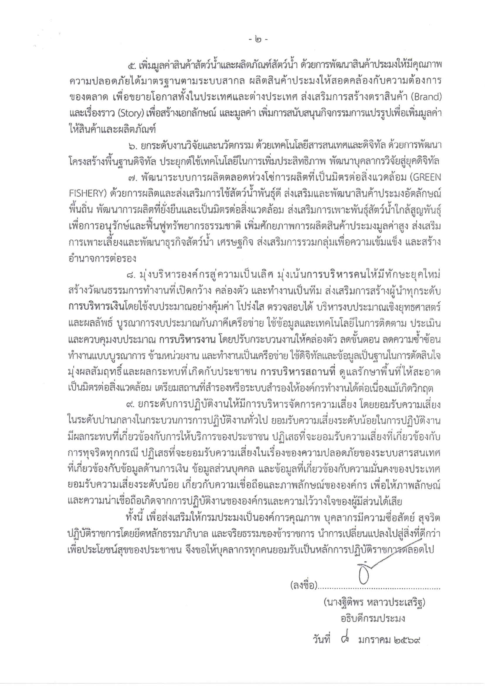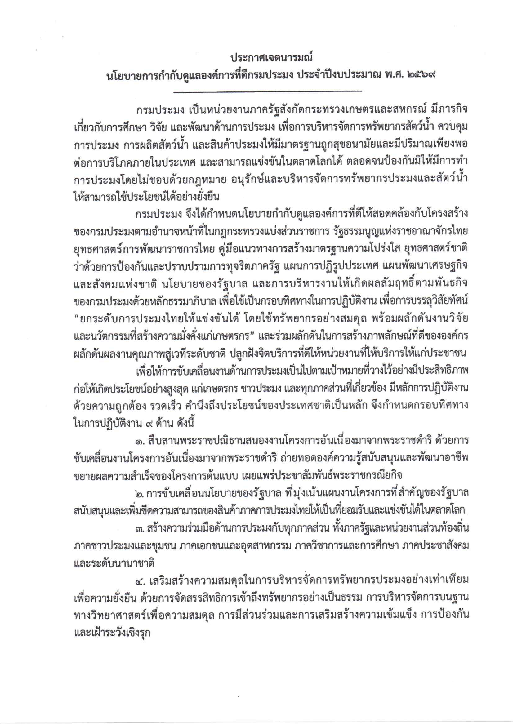 ประกาศกรมประมง เรื่อง นโยบายการกำกับดูแลองค์การที่ดี กรมประมง ประจำปีงบประมาณ พ.ศ. 2569