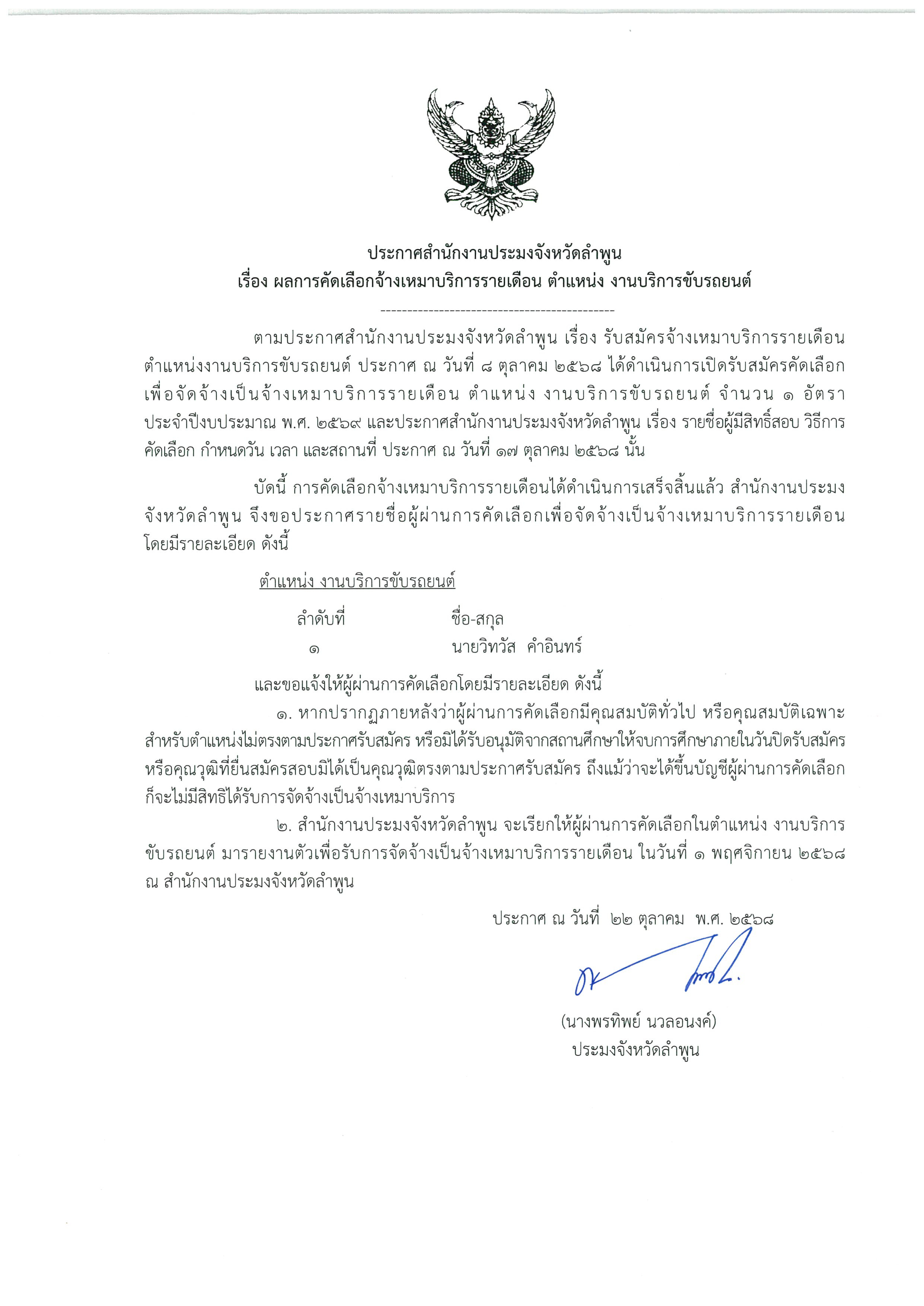 จังหวัดลำพูน จึงขอประกาศรายชื่อผู้ผ่านการคัดเลือกเพื่อจัดจ้างเป็นจ้างเหมาบริการรายเดือน
