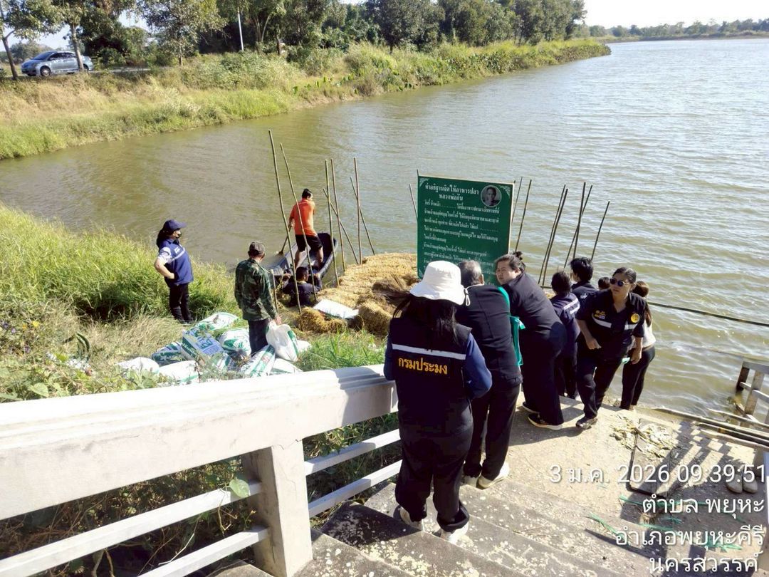 วันเสาร์ที่ 3 มกราคม 2569 เวลา 09.00 น. นายวชิระ กว้างขวาง ประมงจังหวัดนครสวรรค์ มอบหมายให้นางสาวเพ็ญไพรินทร์ สว่างวงศ์ ประมงอำเภอพยุหะคีรี ร่วมกับคณะกรรมการแหล่งน้ำบึงกระดิ่ง และผู้นำชุมชนตำบลพยุหะ ดำเนินกิจกรรมสร้างอาหารธรรมชาติ (แซนวิสปลา) จำนวน 2 จุด ตามโครงการบริหารจัดการทรัพยากรประมง กิจกรรมบริหารจัดการทรัพยากรประมงน้ำจืด การเพิ่มผลผลิตสัตว์น้ำในแหล่งน้ำชุมชนเพื่อเพิ่มรายได้และลดค่าครองชีพของประชาชน ประจำปีงบประมาณ 2569 ณ บึงกระดิ่ง บ้านท่าแร่ หมู่ที่ 7 ตำบลพยุหะ อำเภอพยุหะคีรี จังหวัดนครสวรรค์
