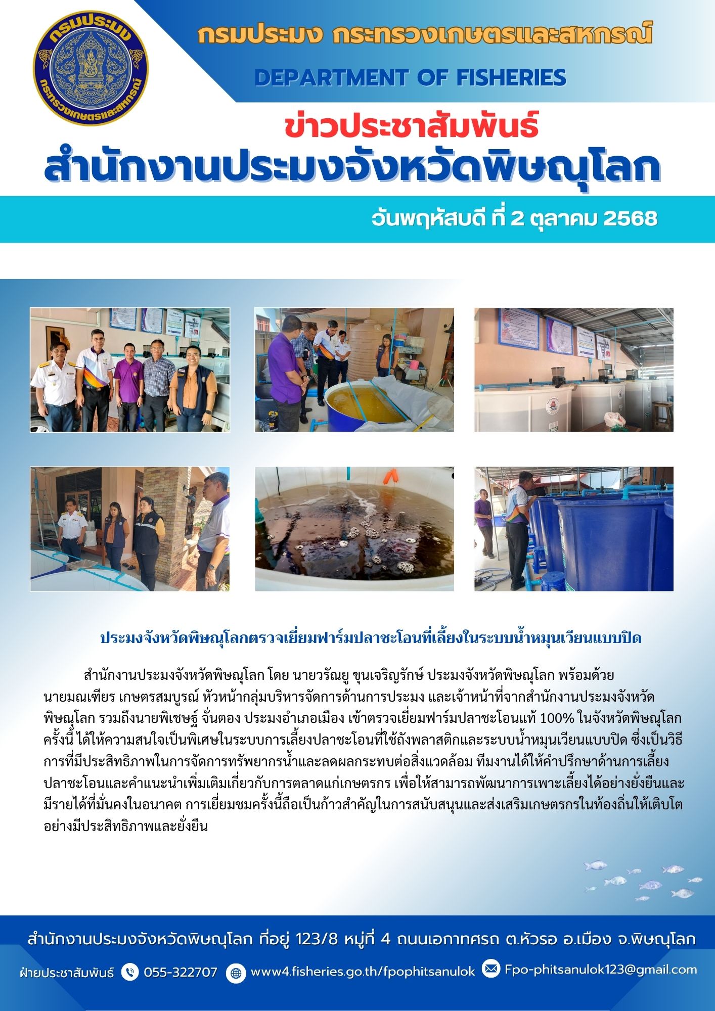 สำนักงานประมงจังหวัดพิษณุโลก เลขที่ 50 เกษตรกลาง เขตจตุจักร กรุงเทพมหานคร 10900