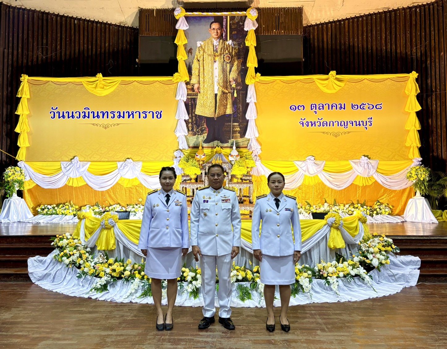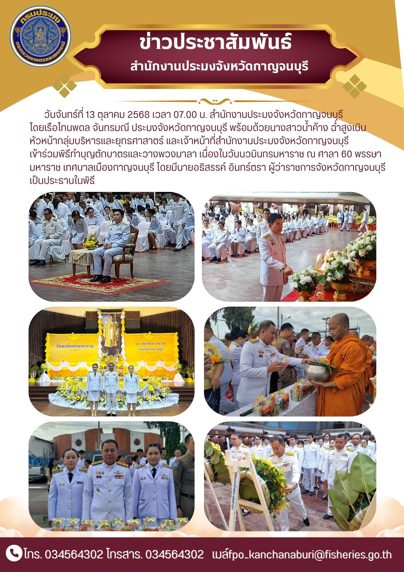 วันจันทร์ที่ 13 ตุลาคม 2568 เวลา 07.00 น. สำนักงานประมงจังหวัดกาญจนบุรี โดยเรือโทนพดล จันทรมณี ประมงจังหวัดกาญจนบุรี พร้อมด้วยนางสาวน้ำค้าง ฉ่ำสูงเนิน หัวหน้ากลุ่มบริหารและยุทธศาสาตร์ และเจ้าหน้าที่สำนักงานประมงจังหวัดกาญจนบุรี เข้าร่วมพิธีทำบุญตักบาตรและวางพวงมาลา เนื่องในวันนวมินทรมหาราช ณ ศาลา 60 พรรษามหาราช เทศบาลเมืองกาญจนบุรี โดยมีนายอธิสรรค์ อินทร์ตรา ผู้ว่าราชการจังหวัดกาญจนบุรี เป็นประธานในพิธี