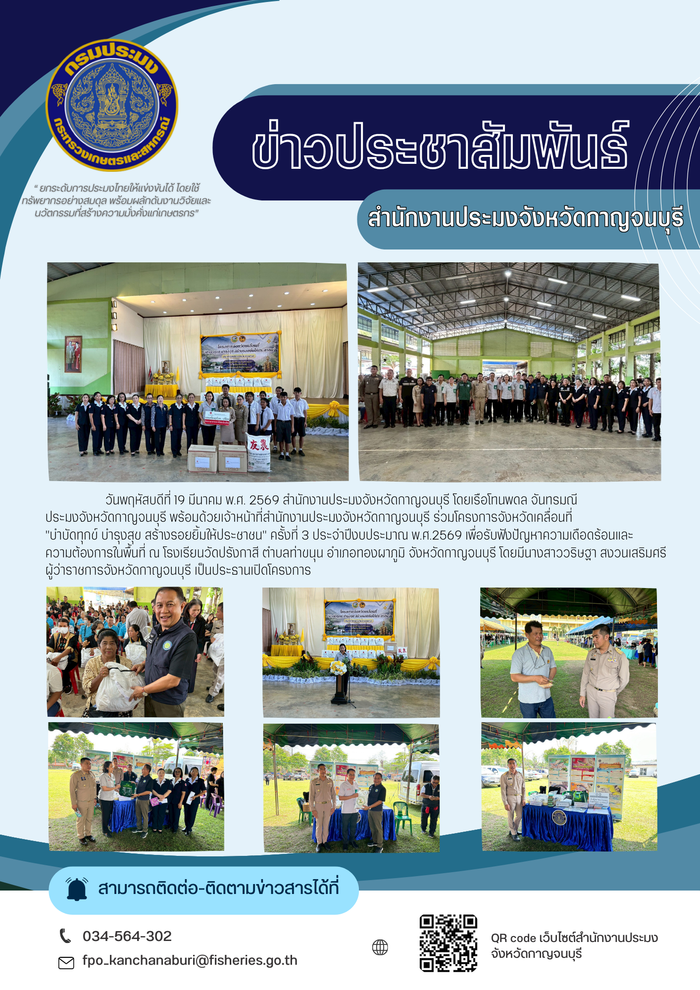 วันพฤหัสบดีที่ 19 มีนาคม พ.ศ. 2569 สำนักงานประมงจังหวัดกาญจนบุรี โดยเรือโทนพดล จันทรมณี ประมงจังหวัดกาญจนบุรี พร้อมด้วยเจ้าหน้าที่สำนักงานประมงจังหวัดกาญจนบุรี ร่วมโครงการจังหวัดเคลื่อนที่ "บำบัดทุกข์ บำรุงสุข สร้างรอยยิ้มให้ประชาชน" ครั้งที่ 3 ประจำปีงบประมาณ พ.ศ.2569 เพื่อรับฟังปัญหาความเดือดร้อนและ ความต้องการในพื้นที่ ณ โรงเรียนวัดปรังกาสี ตำบลท่าขนุน อำเภอทองผาภูมิ จังหวัดกาญจนบุรี โดยมีนางสาววริษฐา สงวนเสริมศรี ผู้ว่าราชการจังหวัดกาญจนบุรี เป็นประธานเปิดโครงการ