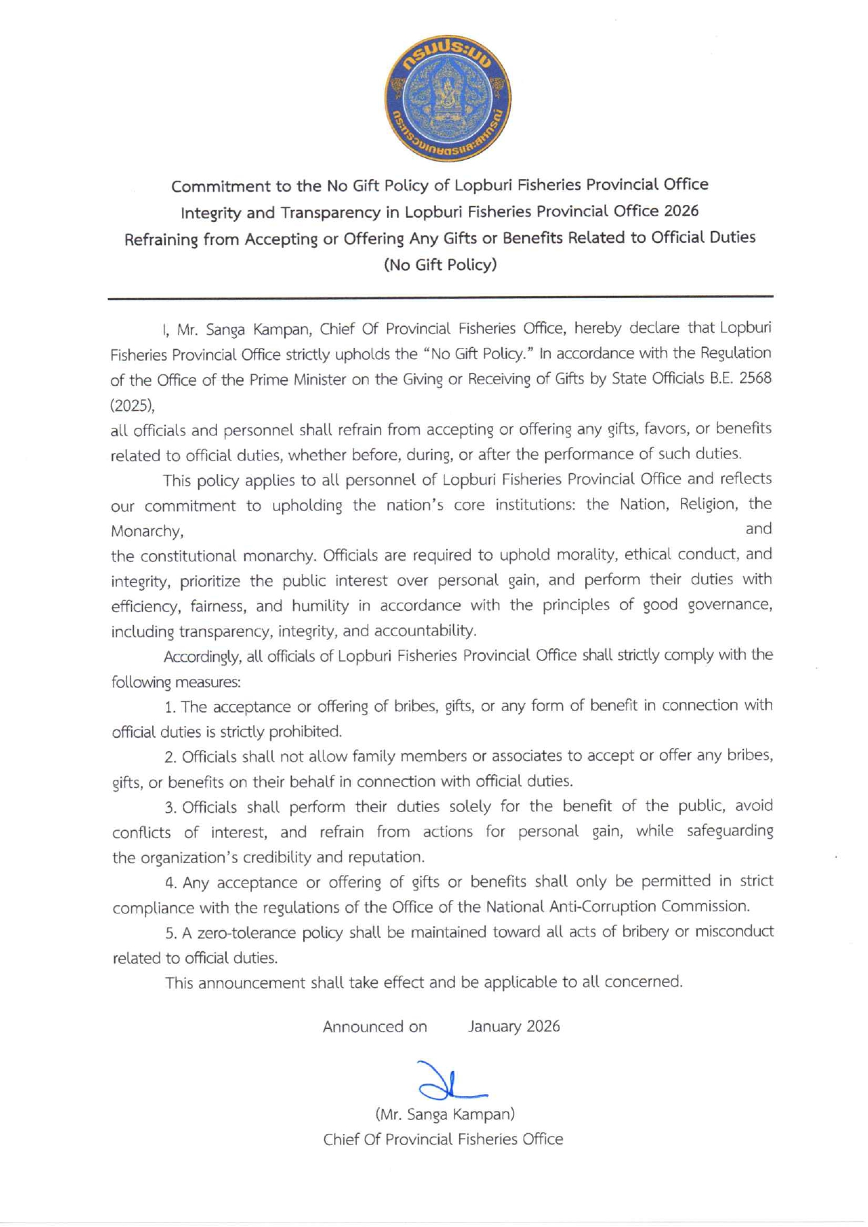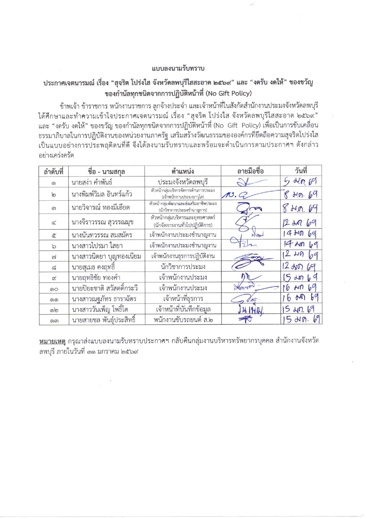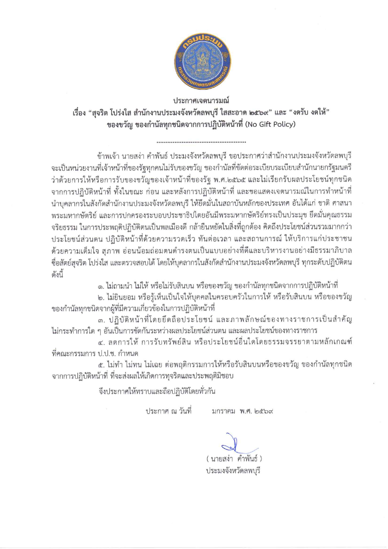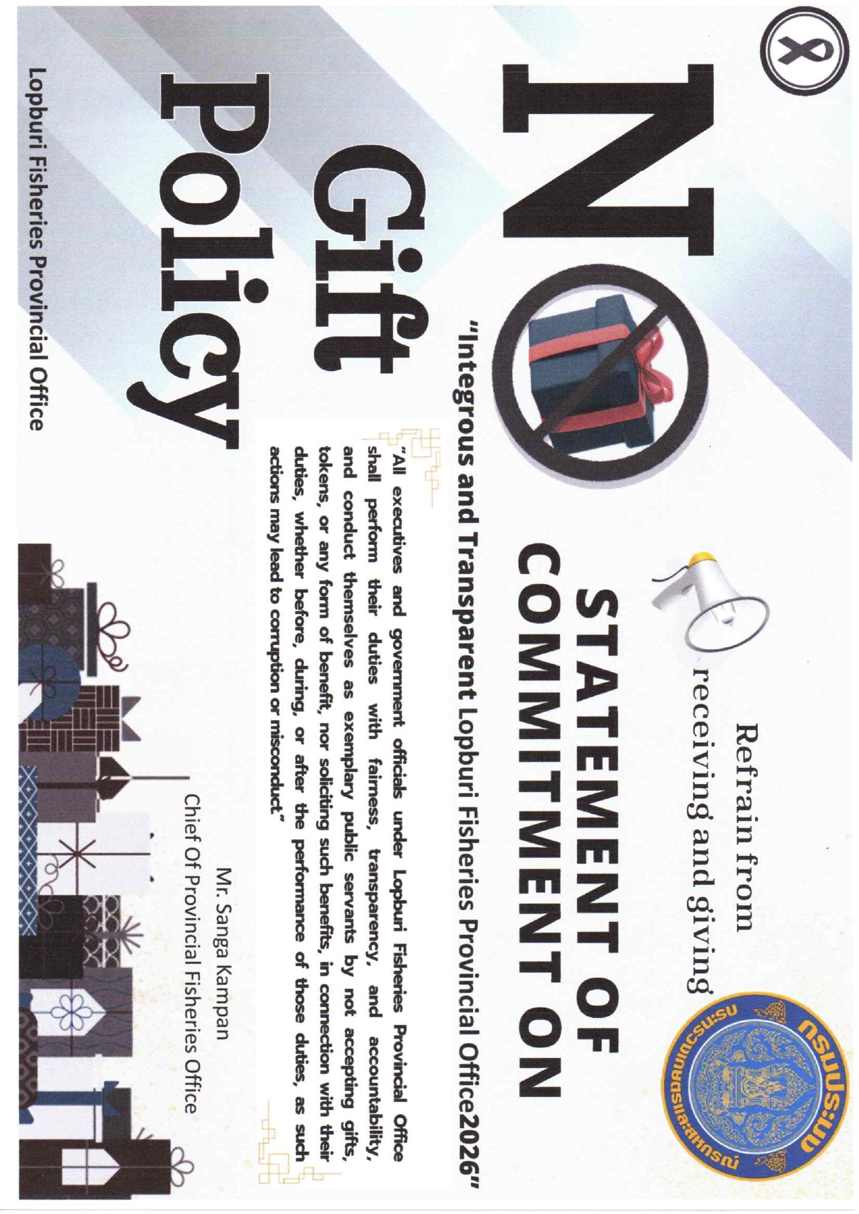 การลงนามรับทราบประกาศเจตนารมณ์ "สุจริต โปร่งใส งดรับ งดให้" ของขวัญ ของกำนัลทุกชนิดจากการปฏิบัติหน้าที่ No Gift Policy ของสำนักงานประมงจังหวัดลพบุรี