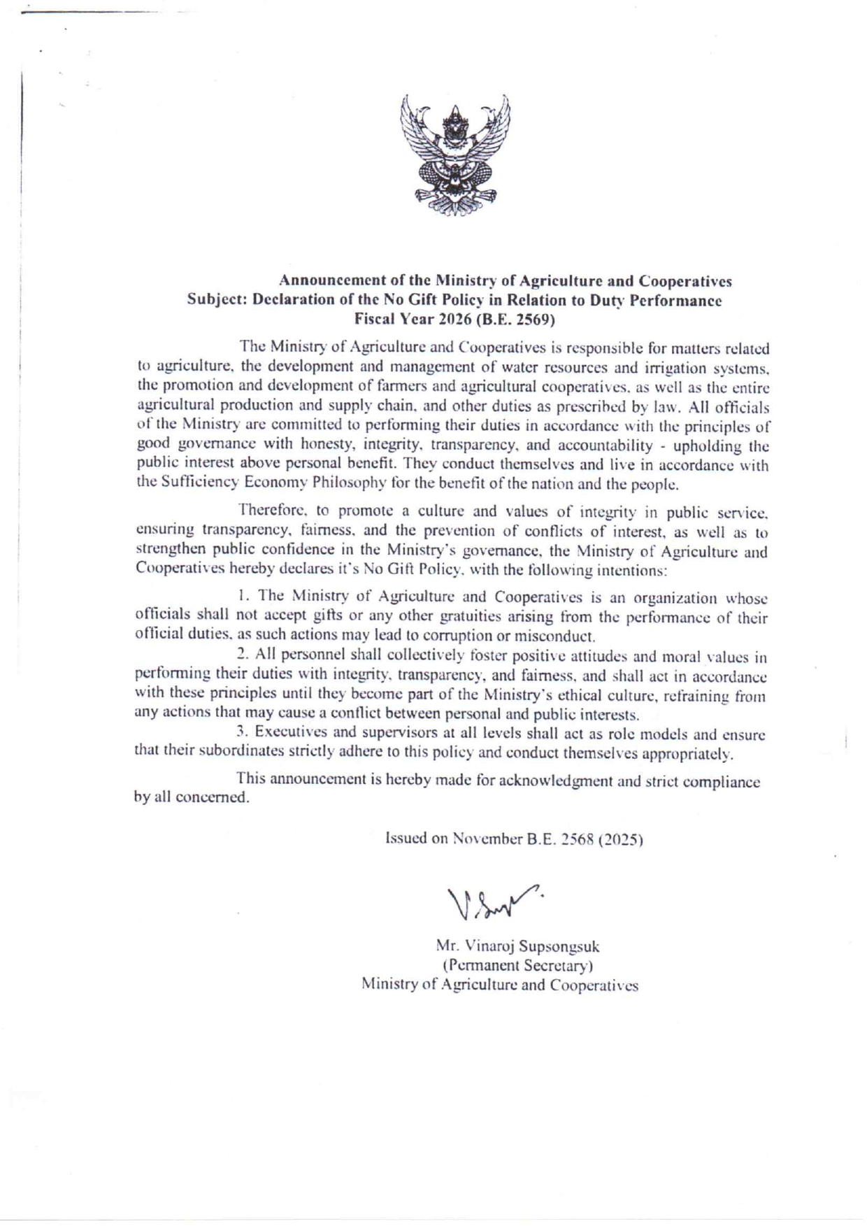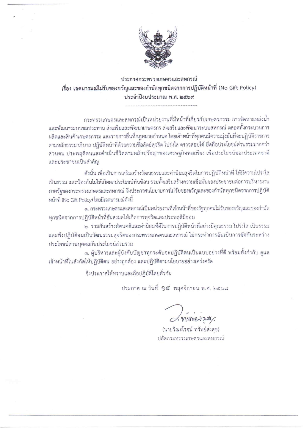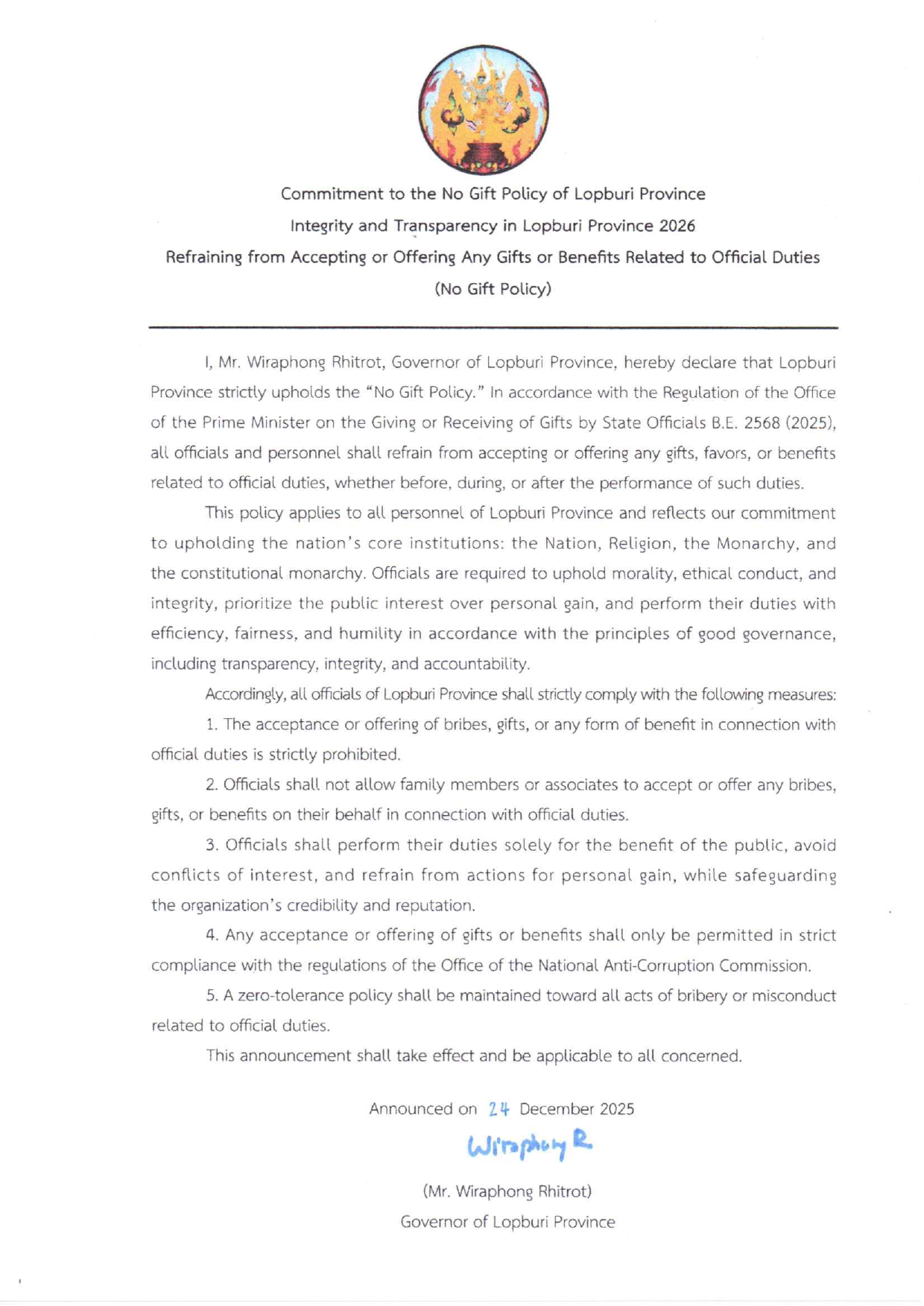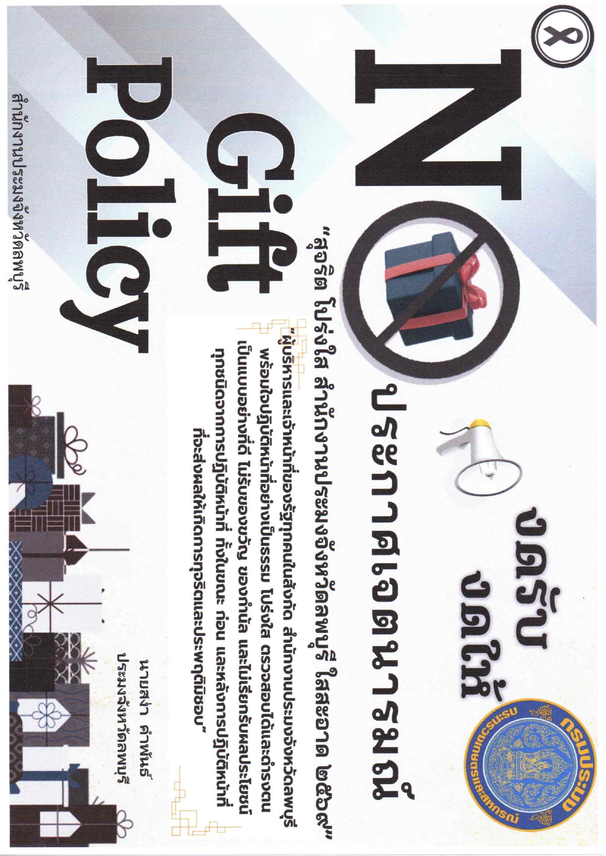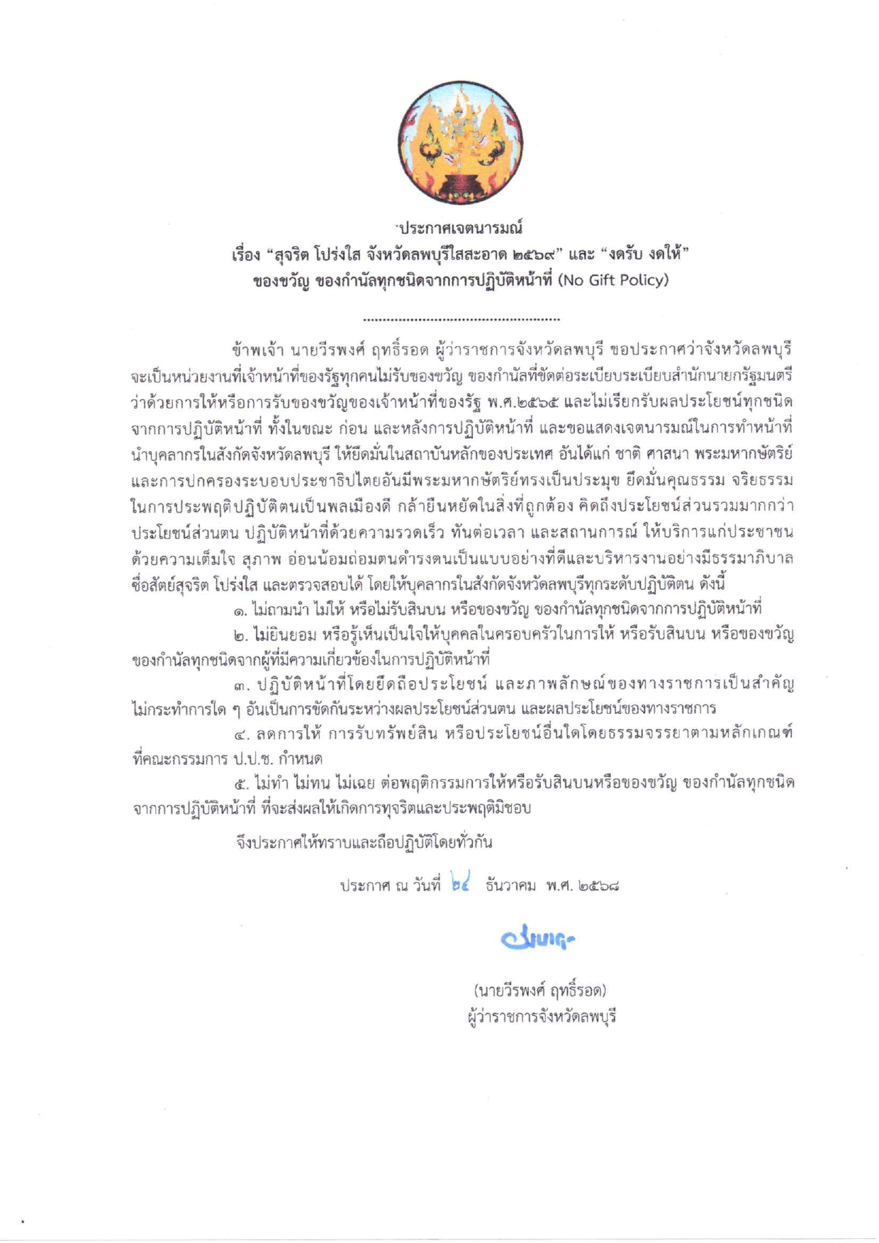 การลงนามรับทราบประกาศเจตนารมณ์ "สุจริต โปร่งใส งดรับ งดให้" ของขวัญ ของกำนัลทุกชนิดจากการปฏิบัติหน้าที่ No Gift Policy ของสำนักงานประมงจังหวัดลพบุรี