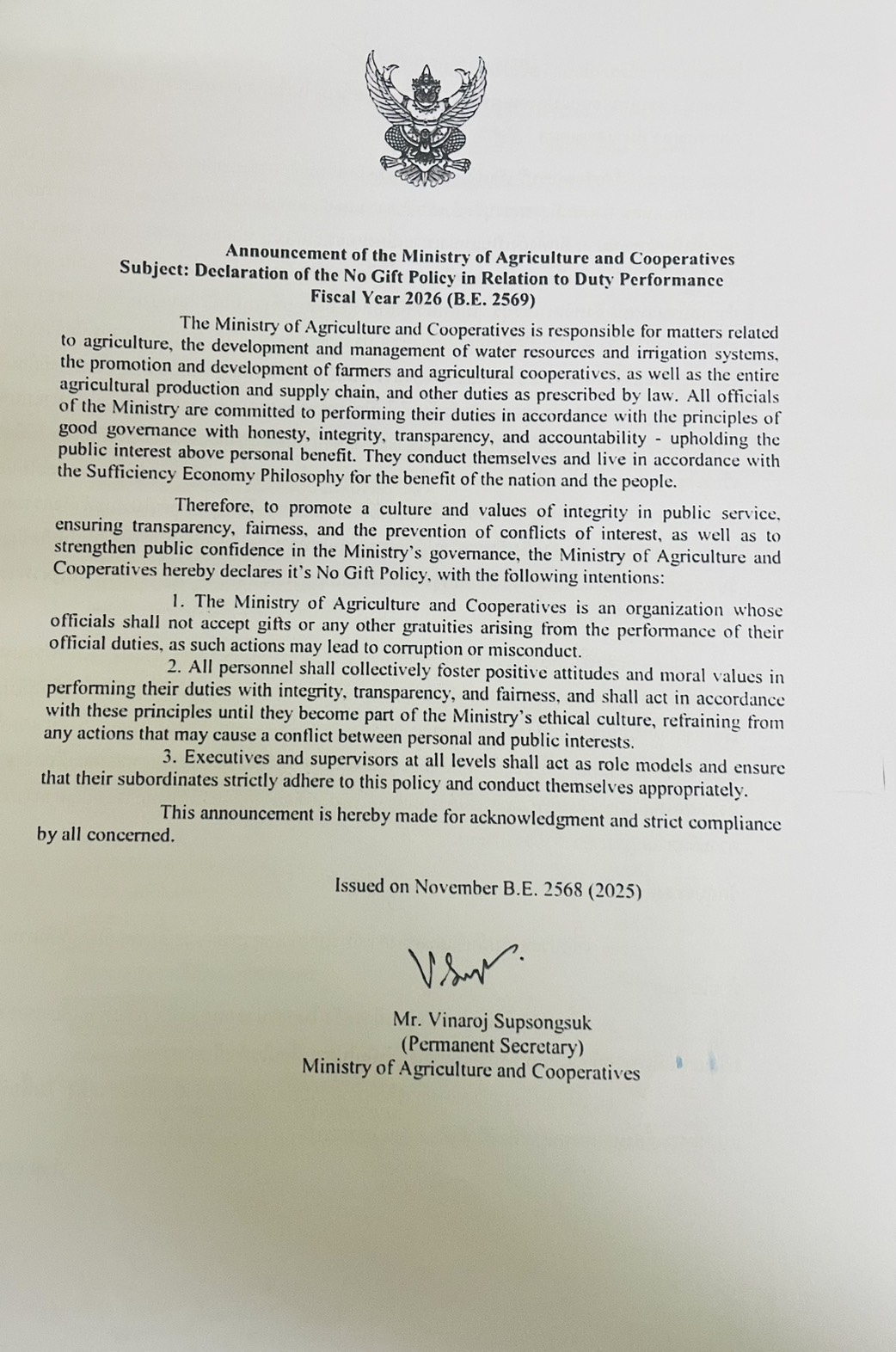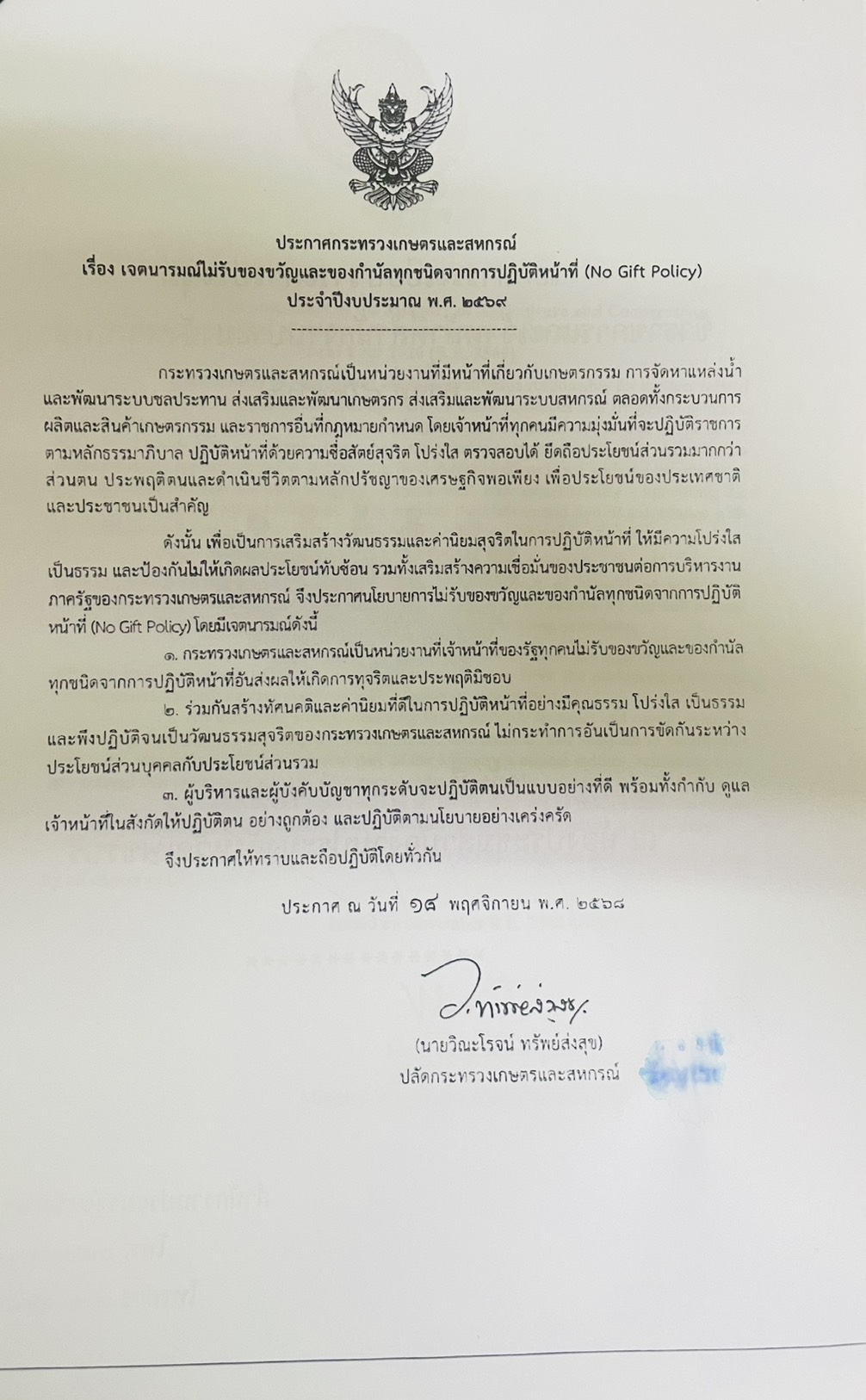 ประกาศกระทรวงเกษตรและสหกรณ์ เรื่อง เจตนารมณ์ไม่รับของขวัญและของกำนัลทุกชนิดจากการปฏิบัติหน้าที่ (No Gift Policy) ประจำปีงบประมาณ พ.ศ. ๒๕๖๙