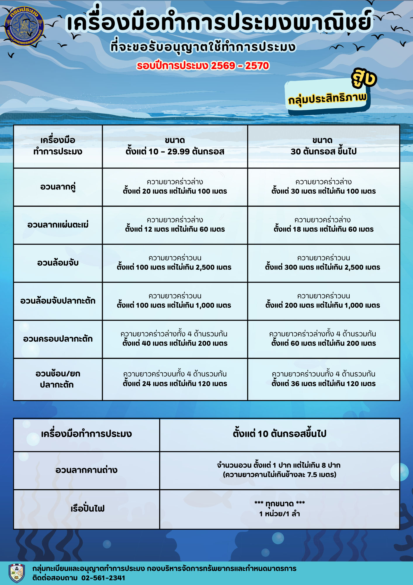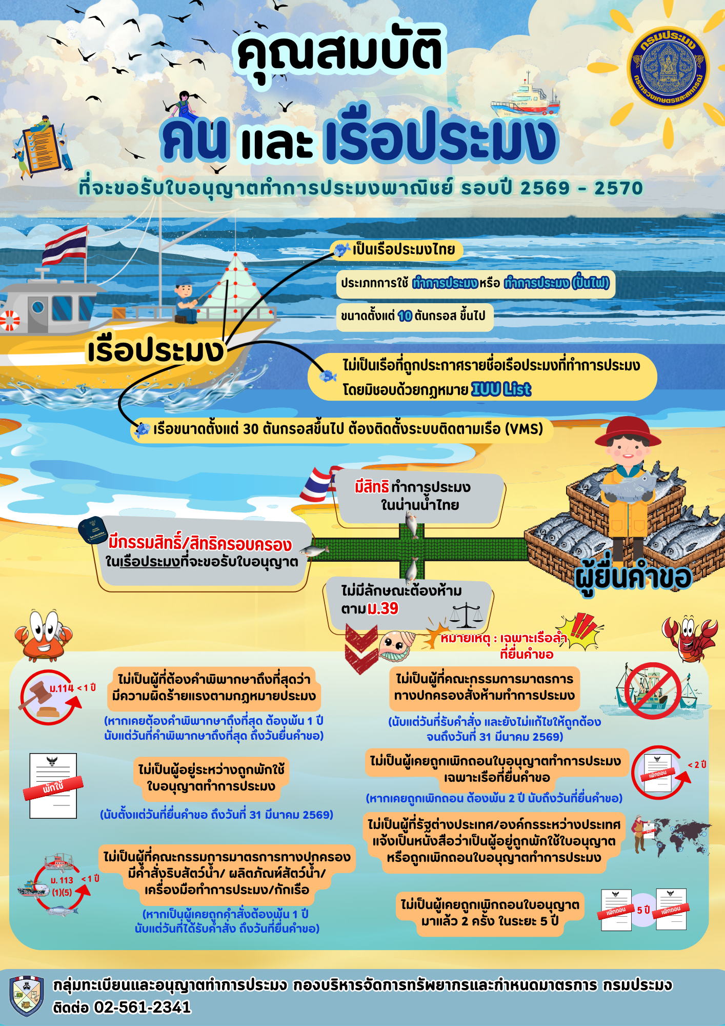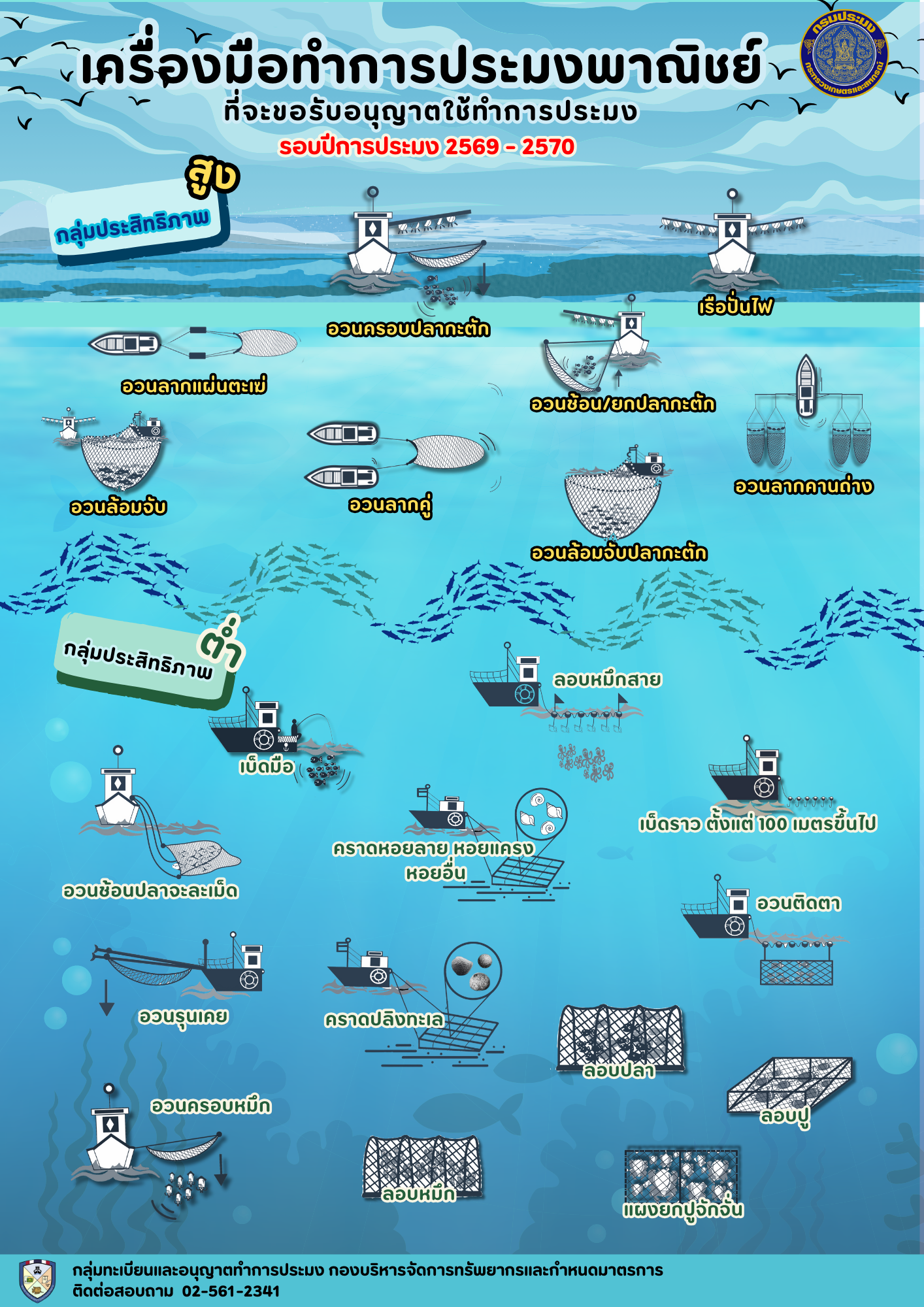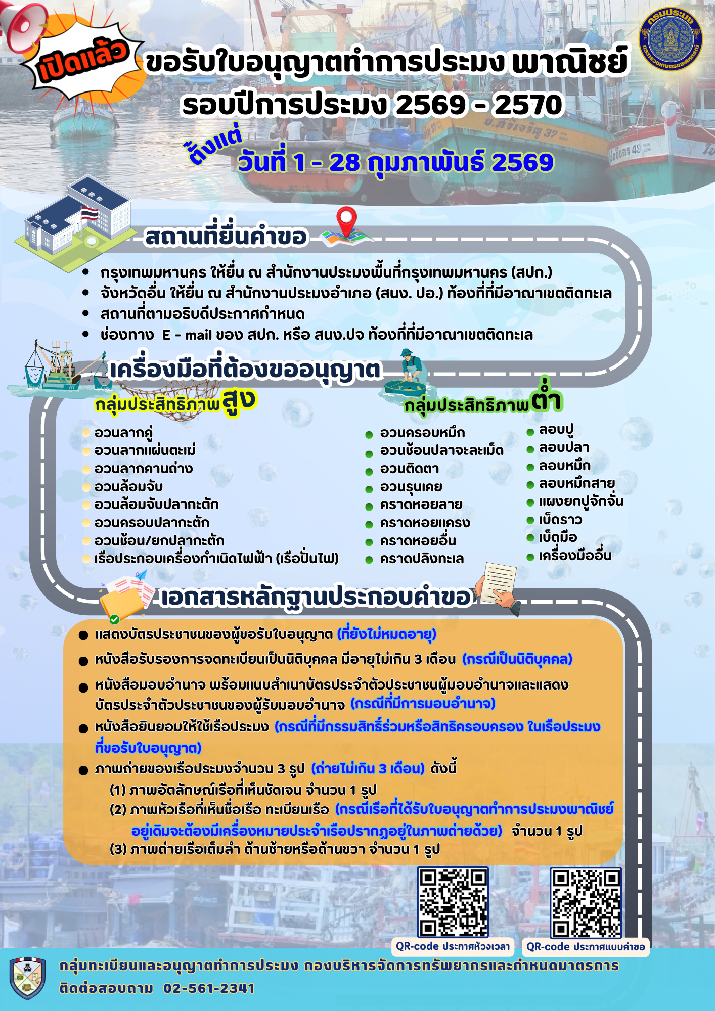 [2026-02-03] การจัดตั้งสำนักงานเร่งรัดการวิจัยและนวัตกรรมเพื่อเพิ่มความสามารถการแข่.. [2026-01-27] การขอรับใบอนุญาตทำการประมงพื้นบ้าน.. [2026-01-27] การขอรับใบอนุญาตทำการประมงพาณิชย์.. [2026-01-27] กรมประมงได้จัดทำรายงานประจำปี 2568 ของสำนักงานเลขานุการกรม.. [2026-01-23] ประกาศเจตนารมณ์ เรื่อง "สุจริต โปร่งใส จังหวัดเพชรบุรีใสสะอาด 2569" แล.. [2026-01-23] ประกาศกรมประมง เรื่อง เจตนารมณ์ไม่รับของขวัญและของกำนัลทุกชนิดจากการปฏ.. [2026-01-14] ประกาศหลักเกณฑ์ วิธีการ และประกาศรับสมัครคัดเลือกข้าราชการพลเรือนสามัญ.. [2026-01-14] ประกาศกรมประมง เรื่อง นโยบายการกำกับดูแลองค์การที่ดี กรมประมง ประจำปีง.. [2026-01-12] การรับสมัครบุคคลเข้ารับการคัดเลือกเพื่อแต่งตั้งเป็นกรรมการผู้ทรงคุณวุฒ.. [2026-01-12] ขอประชาสัมพันธ์แจ้งแผนการส่งน้ำเพื่อปลูกพืชในฤดูแล้ง ปี พ.ศ.2569.. อ่านทั้งหมด