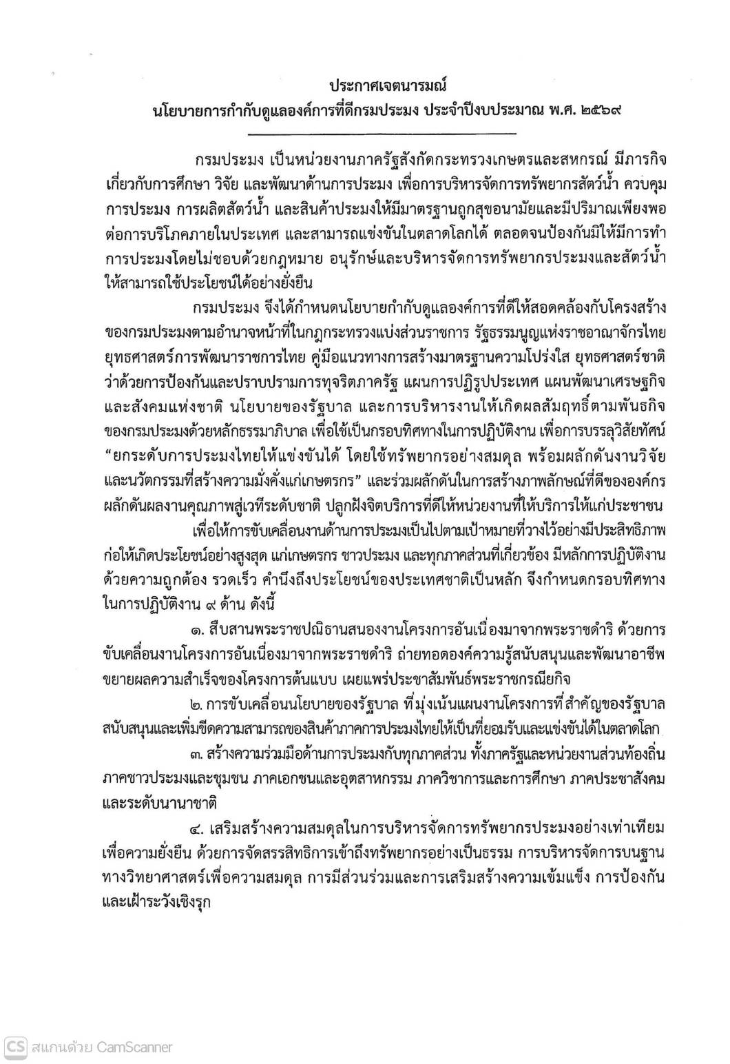 นโยบายการกำกับดูแลองค์การที่ดี กรมประมง ประจำปีงบประมาณ พ.ศ.2569