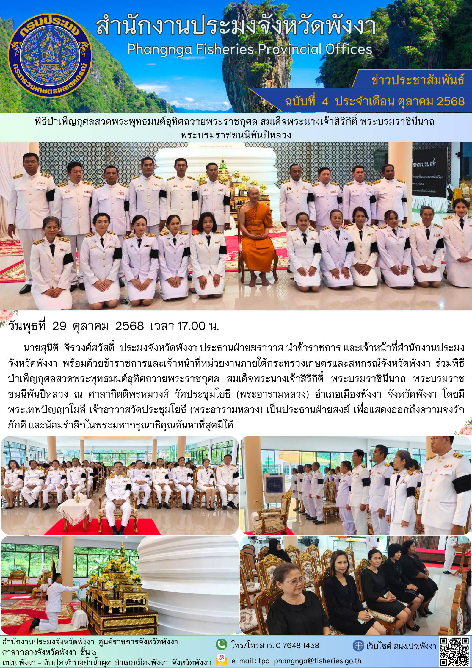 นายสุนิติ จิรวงศ์สวัสดิ์ ประมงจังหวัดพังงา ประธานฝ่ายฆราวาส นำข้าราชการ และเจ้าหน้าที่สำนักงานประมงจังหวัดพังงา พร้อมด้วยข้าราชการและเจ้าหน้าที่หน่วยงานภายใต้กระทรวงเกษตรและสหกรณ์จังหวัดพังงา ร่วมพิธีบำเพ็ญกุศลสวดพระพุทธมนต์อุทิศถวายพระราชกุศล สมเด็จพระนางเจ้าสิริกิติ์ พระบรมราชินีนาถ พระบรมราชชนนีพันปีหลวง ณ ศาลากิตติพรหมวงศ์ วัดประชุมโยธี (พระอารามหลวง) อำเภอเมืองพังงา จังหวัดพังงา โดยมีพระเทพปัญญาโมลี เจ้าอาวาสวัดประชุมโยธี (พระอารามหลวง) เป็นประธานฝ่ายสงฆ์ เพื่อแสดงออกถึงความจงรักภักดี และน้อมรำลึกในพระมหากรุณาธิคุณอันหาที่สุดมิได้
