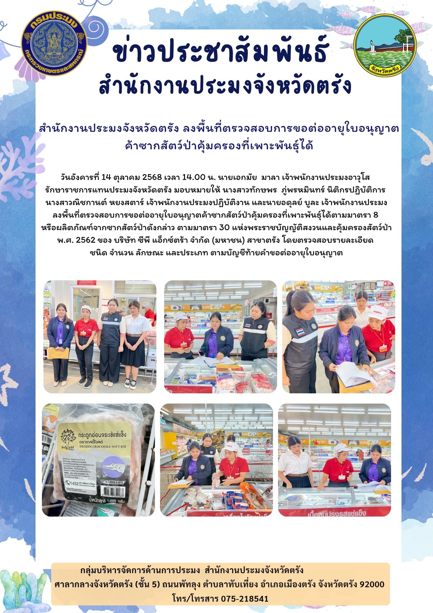 สำนักงานประมงจังหวัดตรัง ลงพื้นที่ตรวจสอบการขอต่ออายุใบอนุญาตค้าซากสัตว์ป่าคุ้มครองที่เพาะพันธุ์ได้