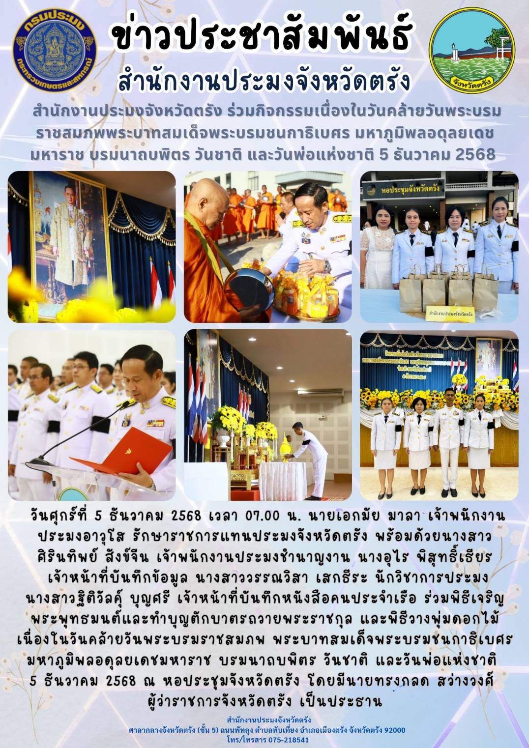 สำนักงานประมงจังหวัดตรัง ร่วมกิจกรรมเนื่องในวันคล้ายวันพระบรมราชสมภพพระบาทสมเด็จพระบรมชนกาธิเบศร มหาภูมิพลอดุลยเดชมหาราช บรมนาถบพิตร วันชาติ และวันพ่อแห่งชาติ 5 ธันวาคม 2568