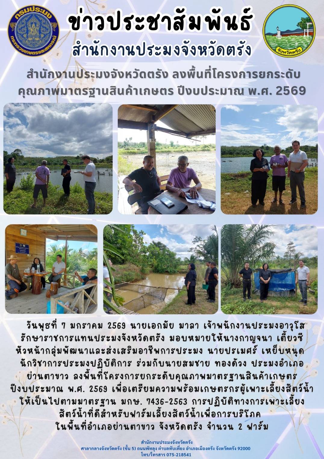 สำนักงานประมงจังหวัดตรัง ลงพื้นที่โครงการยกระดับคุณภาพมาตรฐานสินค้าเกษตร ปีงบประมาณ พ.ศ. 2569