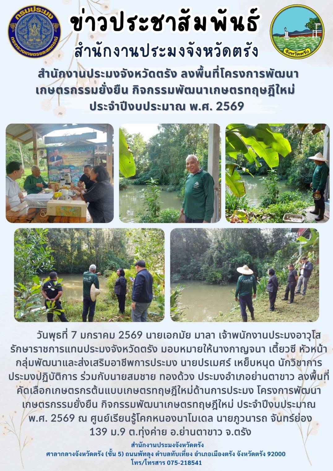 สำนักงานประมงจังหวัดตรัง ลงพื้นที่โครงการพัฒนาเกษตรกรรมยั่งยืน กิจกรรมพัฒนาเกษตรทฤษฎีใหม่ ประจำปีงบประมาณ พ.ศ. 2569