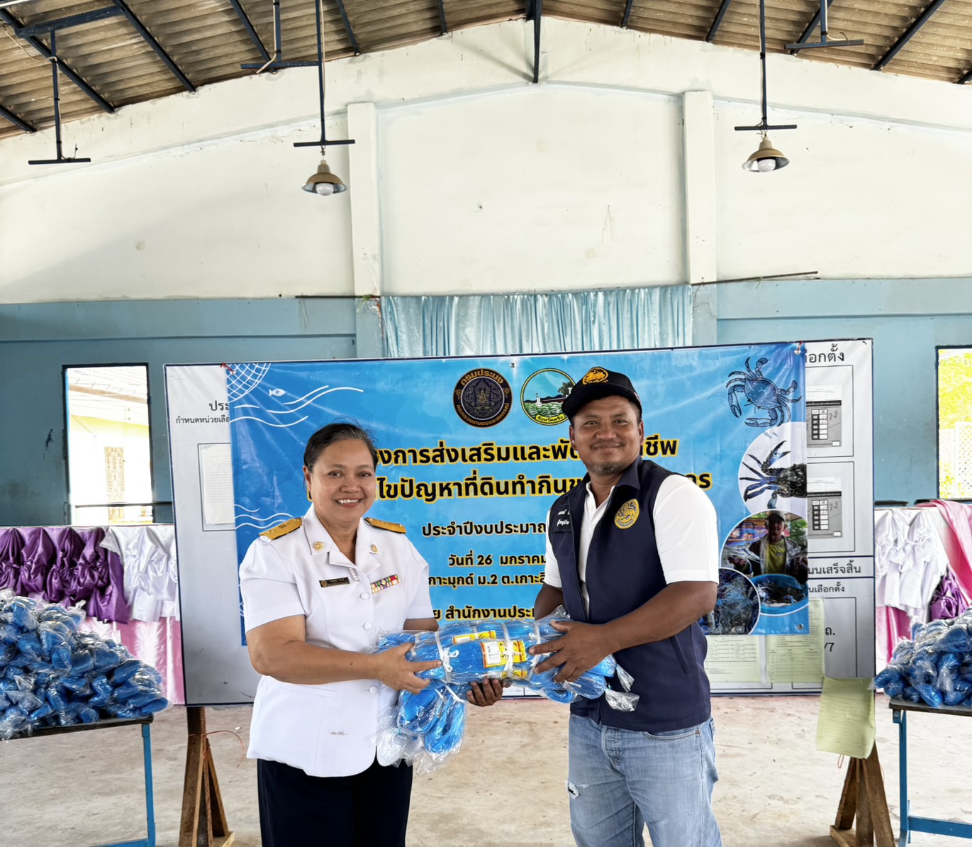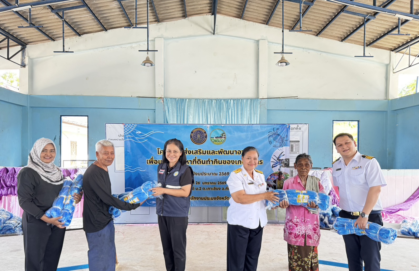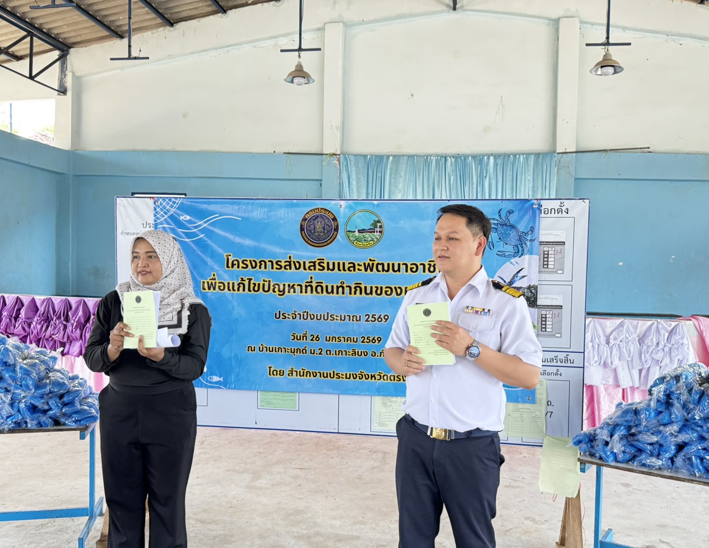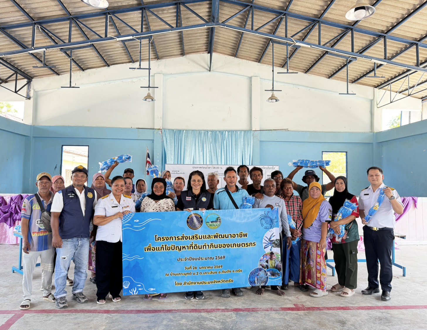 วันจันทร์ที่ 26 มกราคม 2569 สำนักงานประมงจังหวัดตรัง ลงพื้นที่ดำเนินงานโครงการส่งเสริมและพัฒนาอาชีพเพื่อแก้ไขปัญหาที่ดินทำกินของเกษตรกร ประจำปีงบประมาณ 2569 ทั้งมอบปัจจัยการผลิต (อวนปู) ให้แก่เกษตรกรในพื้นที่อำเภอกันตัง จำนวน 24 ราย รายละ 11 ผืน ณ โรงเรียนบ้านเกาะมุกด์ หมู่ที่ 2 ตำบลเกาะลิบง อำเภอกันตัง จังหวัดตรัง