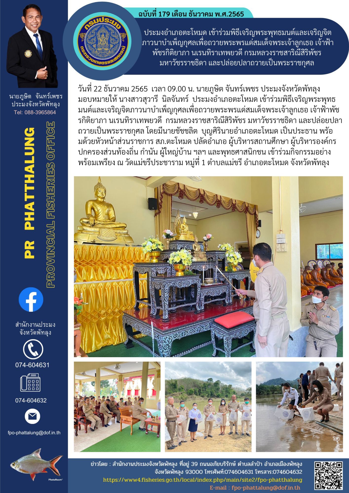 วันที่ 22 ธันวาคม 2565 เวลา 09.00 น. นายภูษิต จันทร์เพชร ประมงจังหวัดพัทลุง มอบหมายให้ นางสาวสุวารี นิลจันทร์ ประมงอำเภอตะโหมด เข้าร่วมพิธีเจริญพระพุทธมนต์และเจริญจิตภาวนาบำเพ็ญกุศลเพื่อถวายพระพรแด่สมเด็จพระเจ้าลูกเธอ เจ้าฟ้าพัชรกิติยาภา นเรนทิราเทพยวดี กรมหลวงราชสาริณีสิริพัชร มหาวัชรราชธิดา และปล่อยปลาถวายเป็นพระราชกุศล โดยมีนายชัชชลิต บุญศิรินายอำเภอตะโหมด เป็นประธาน พรัอมด้วยหัวหน้าส่วนราชการ สภ.ตะโหมด ปลัดอำเภอ ผู้บริหารสถานศึกษา ผู้บริหารองค์กรปกครองส่วนท้องถิ่น กำนัน ผู้ใหญ่บ้าน ฯลฯ และพุทธศาสนิกชน เข้าร่วมกิจกรรมอย่างพร้อมเพรียง ณ วัดแม่ขรีประชาราม หมู่ที่ 1 ตำบลแม่ขรี อำเภอตะโหมด จังหวัดพัทลุง