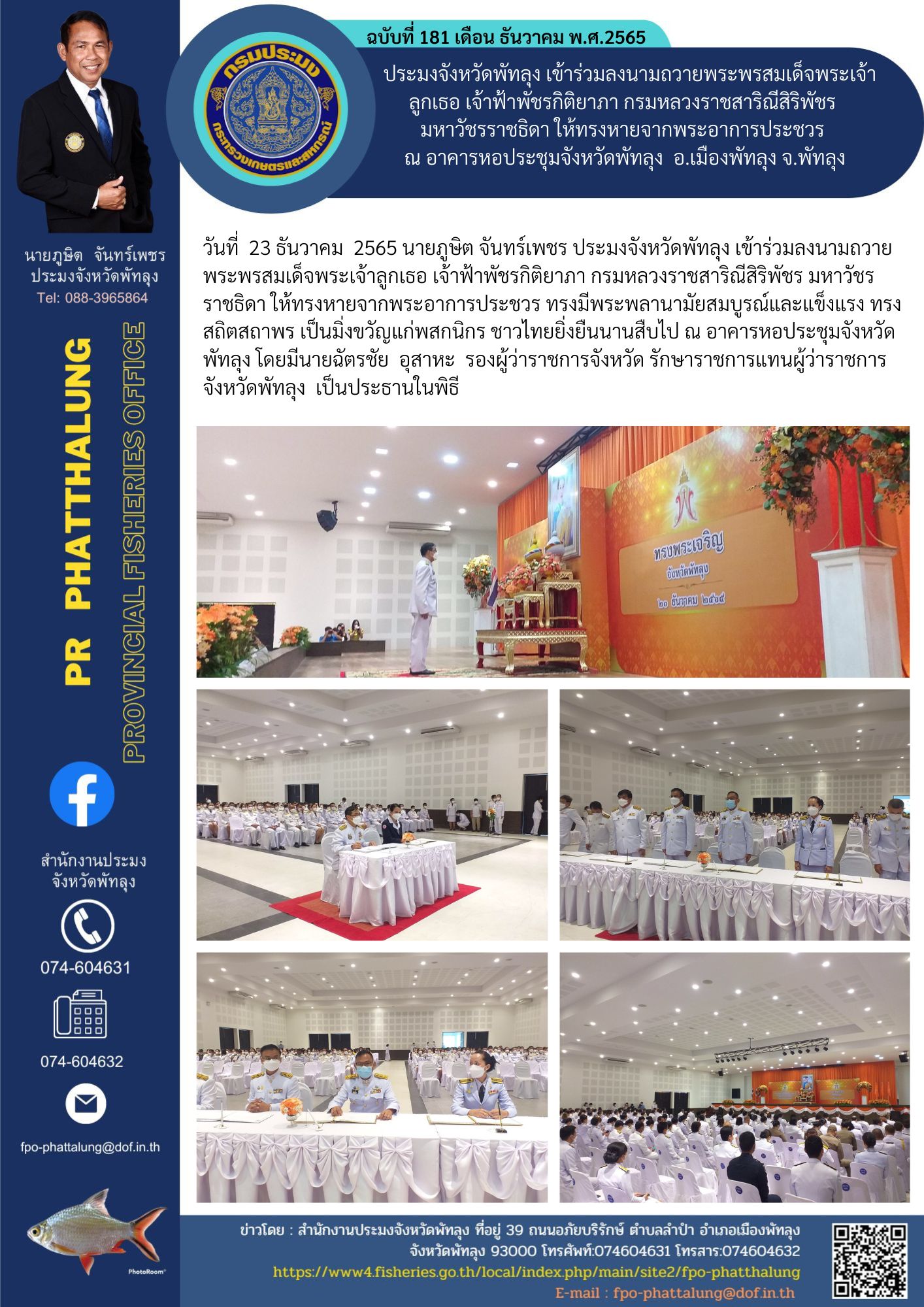 ประมงจังหวัดพัทลุง เข้าร่วมลงนามถวายพระพรสมเด็จพระเจ้าลูกเธอ เจ้าฟ้าพัชรกิติยาภา กรมหลวงราชสาริณีสิริพัชร มหาวัชรราชธิดา ให้ทรงหายจากพระอาการประชวร ณ อาคารหอประชุมจังหวัดพัทลุง อ.เมืองพัทลุง จ.พัทลุง