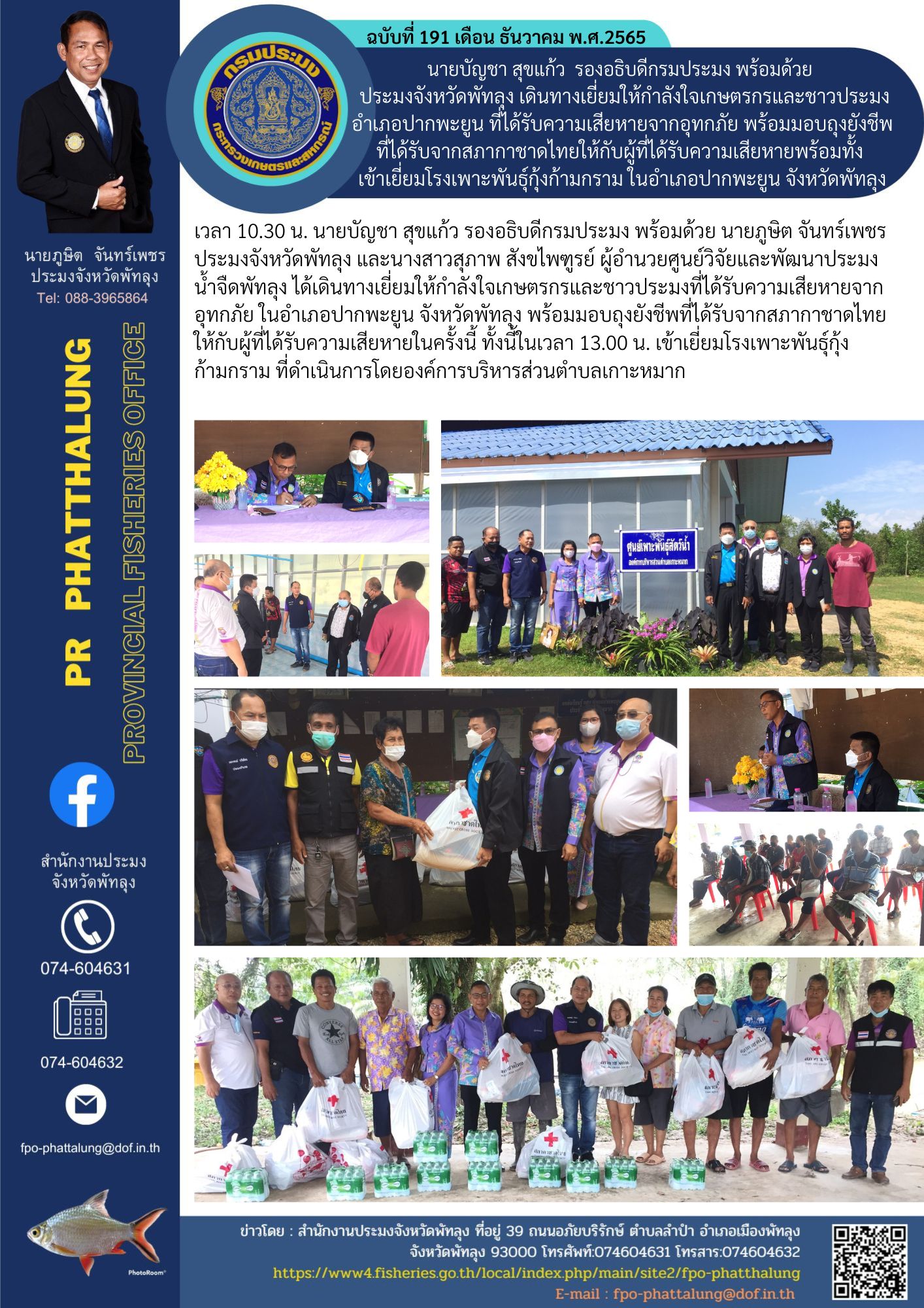 นายบัญชา สุขแก้ว รองอธิบดีกรมประมง พร้อมด้วย ประมงจังหวัดพัทลุง เดินทางเยี่ยมให้กำลังใจเกษตรกรและชาวประมงอำเภอปากพะยูน ที่ได้รับความเสียหายจากอุทกภัย พร้อมมอบถุงยังชีพที่ได้รับจากสภากาชาดไทยให้กับผู้ที่ได้รับความเสียหายพร้อมทั้ง เข้าเยี่ยมโรงเพาะพันธุ์กุ้งก้ามกราม ในอำเภอปากพะยูน จังหวัดพัทลุง