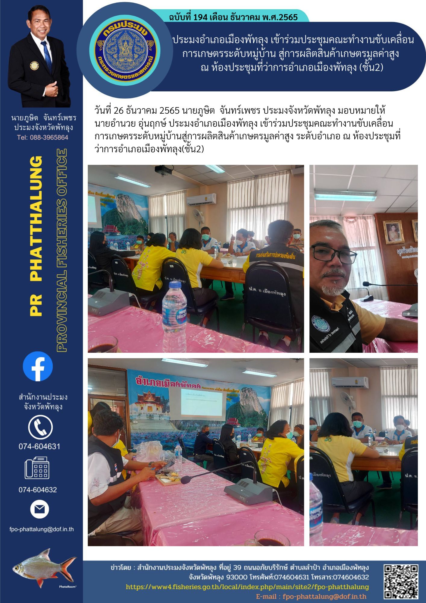 วันที่ 26 ธันวาคม 2565 นายภูษิต จันทร์เพชร ประมงจังหวัดพัทลุง มอบหมายให้ นายอำนวย อุ่นฤกษ์ ประมงอำเภอเมืองพัทลุง เข้าร่วมประชุมคณะทำงานขับเคลื่อนการเกษตรระดับหมู่บ้านสู่การผลิตสินค้าเกษตรมูลค่าสูง ระดับอำเภอ ณ ห้องประชุมที่ว่าการอำเภอเมืองพัทลุง(ชั้น2)