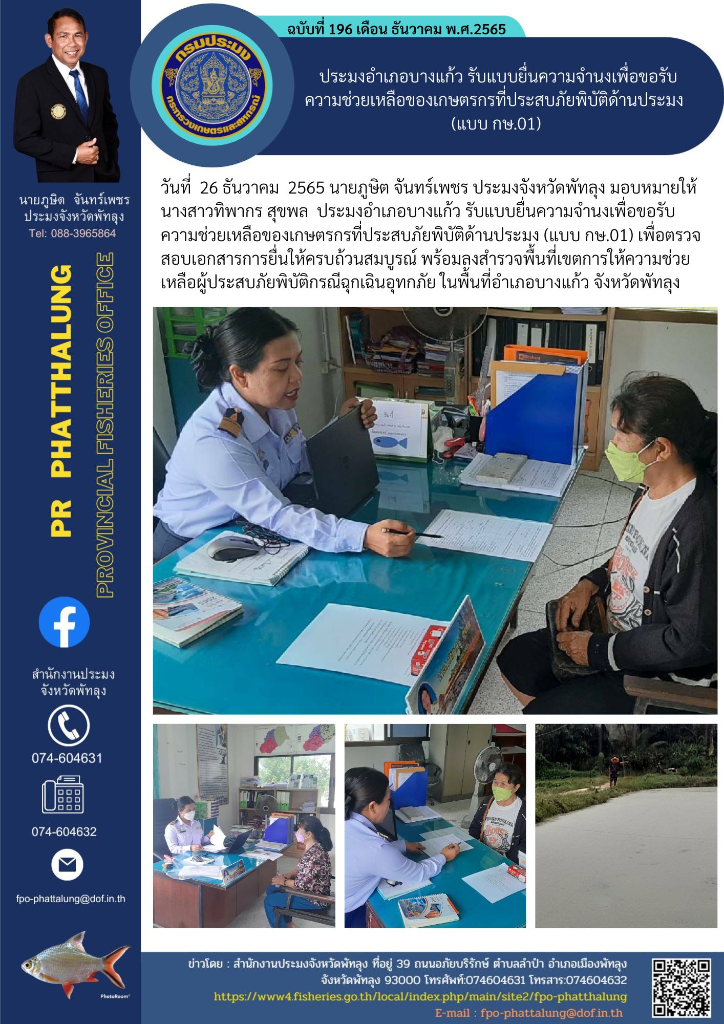 วันที่ 26 ธันวาคม 2565 นายภูษิต จันทร์เพชร ประมงจังหวัดพัทลุง มอบหมายให้นางสาวทิพากร สุขพล ประมงอำเภอบางแก้ว รับแบบยื่นความจำนงเพื่อขอรับความช่วยเหลือของเกษตรกรที่ประสบภัยพิบัติด้านประมง (แบบ กษ.01) เพื่อตรวจสอบเอกสารการยื่นให้ครบถ้วนสมบูรณ์ พร้อมลงสำรวจพื้นที่เขตการให้ความช่วยเหลือผู้ประสบภัยพิบัติกรณีฉุกเฉินอุทกภัย ในพื้นที่อำเภอบางแก้ว จังหวัดพัทลุง