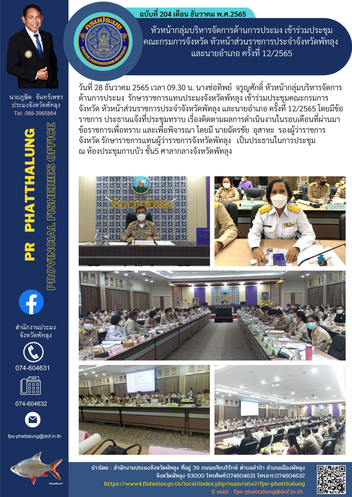 วันที่ 28 ธันวาคม 2565 เวลา 09.30 น. นางช่อทิพย์ จรูญศักดิ์ หัวหน้ากลุ่มบริหารจัดการด้านการประมง รักษาราชการแทนประมงจังหวัดพัทลุง เข้าร่วมประชุมคณะกรมการจังหวัด หัวหน้าส่วนราชการประจำจังหวัดพัทลุง และนายอำเภอ ครั้งที่ 12/2565 โดยมีข้อราชการ ประธานแจ้งที่ประชุมทราบ เรื่องติดตามผลการดำเนินงานในรอบเดือนที่ผ่านมา ข้อราชการเพื่อทราบ และเพื่อพิจารณา โดยมี นายฉัตรชัย อุสาหะ รองผู้ว่าราชการจังหวัด รักษาราชการแทนผู้ว่าราชการจังหวัดพัทลุง เป็นประธานในการประชุม ณ ห้องประชุมกาบบัว ชั้น5 ศาลากลางจังหวัดพัทลุง