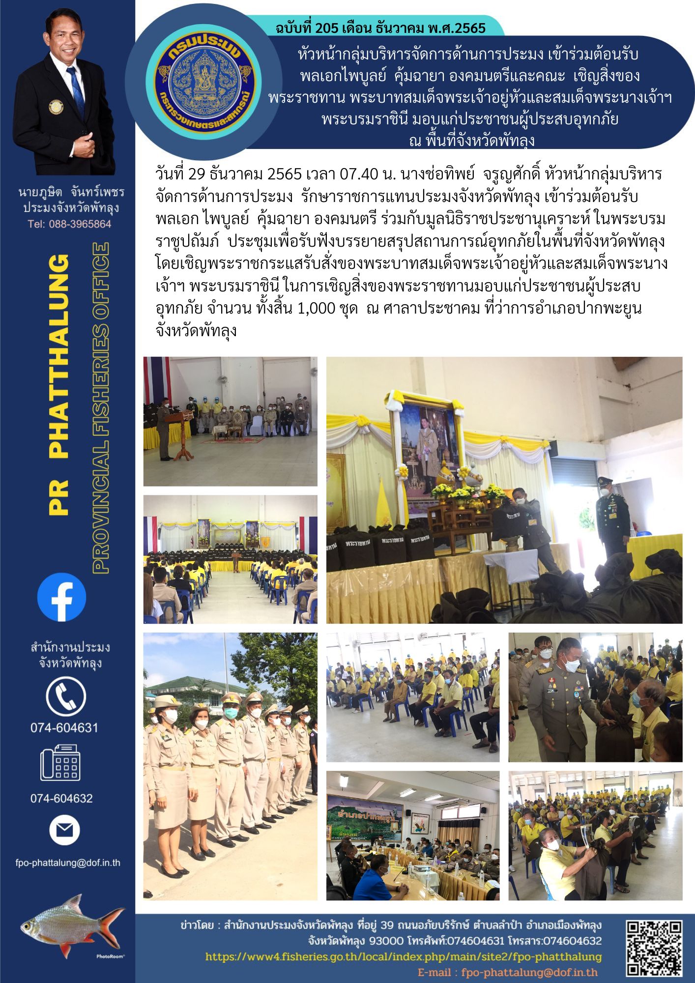 วันที่ 29 ธันวาคม 2565 เวลา 07.40 น. นางช่อทิพย์ จรูญศักดิ์ หัวหน้ากลุ่มบริหารจัดการด้านการประมง รักษาราชการแทนประมงจังหวัดพัทลุง เข้าร่วมต้อนรับ พลเอก ไพบูลย์ คุ้มฉายา องคมนตรี ร่วมกับมูลนิธิราชประชานุเคราะห์ ในพระบรมราชูปถัมภ์ ประชุมเพื่อรับฟังบรรยายสรุปสถานการณ์อุทกภัยในพื้นที่จังหวัดพัทลุง และมอบสิ่งของพระราชทาน โดยเชิญพระราชกระแสรับสั่งของพระบาทสมเด็จพระเจ้าอยู่หัวและสมเด็จพระนางเจ้าฯ พระบรมราชินี ในการเชิญสิ่งของพระราชทาน จำนวน ทั้งสิ้น 1,000 ชุด ณ ศาลาประชาคม ที่ว่าการอำเภปากพะยูน จังหวัดพัทลุง