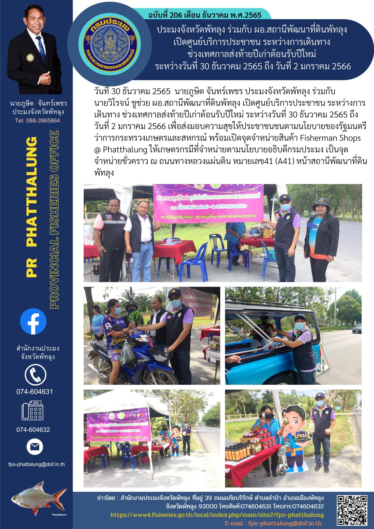 วันที่ 30 ธันวาคม 2565 นายภูษิต จันทร์เพชร ประมงจังหวัดพัทลุง ร่วมกับ นายวิโรจน์ ชูช่วย ผอ.สถานีพัฒนาที่ดินพัทลุง เปิดศูนย์บริการประชาชน ระหว่างการเดินทาง ช่วงเทศกาลส่งท้ายปีเก่าต้อนรับปีใหม่ ระหว่างวันที่ 30 ธันวาคม 2565 ถึง วันที่ 2 มกราคม 2566 เพื่อส่งมอบความสุขให้ประชาชนชนตามนโยบายของรัฐมนตรีว่าการกระทรวงเกษตรและสหกรณ์ พร้อมเปิดจุดจำหน่ายสินค้า Fisherman Shops @ Phatthalung ให้เกษตรกรมีที่จำหน่ายตามนโยบายอธิบดีกรมประมง เป็นจุดจำหน่ายชั่วคราว ณ ถนนทางหลวงแผ่นดิน หมายเลข41 (A41) หน้าสถานีพัฒนาที่ดินพัทลุง