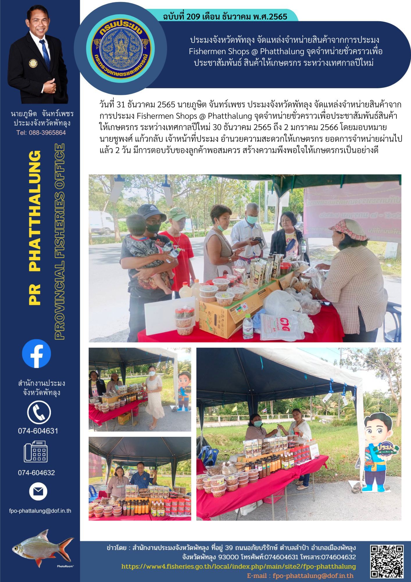 วันที่ 31 ธันวาคม 2565 นายภูษิต จันทร์เพชร ประมงจังหวัดพัทลุง จัดแหล่งจำหน่ายสินค้าจากการประมง Fishermen Shops @ Phatthalung จุดจำหน่ายชั่วคราวเพื่อประชาสัมพันธ์สินค้าให้เกษตรกร ระหว่างเทศกาลปีใหม่ 30 ธันวาคม 2565 ถึง 2 มกราคม 2566 โดยมอบหมาย นายชูพงศ์ แก้วกลับ เจ้าหน้าที่ประมง อำนวยความสะดวกให้เกษตรกร ยอดการจำหน่ายผ่านไปแล้ว 2 วัน มีการตอบรับของลูกค้าพอสมควร สร้างความพึงพอใจให้เกษตรกรเป็นอย่างดี