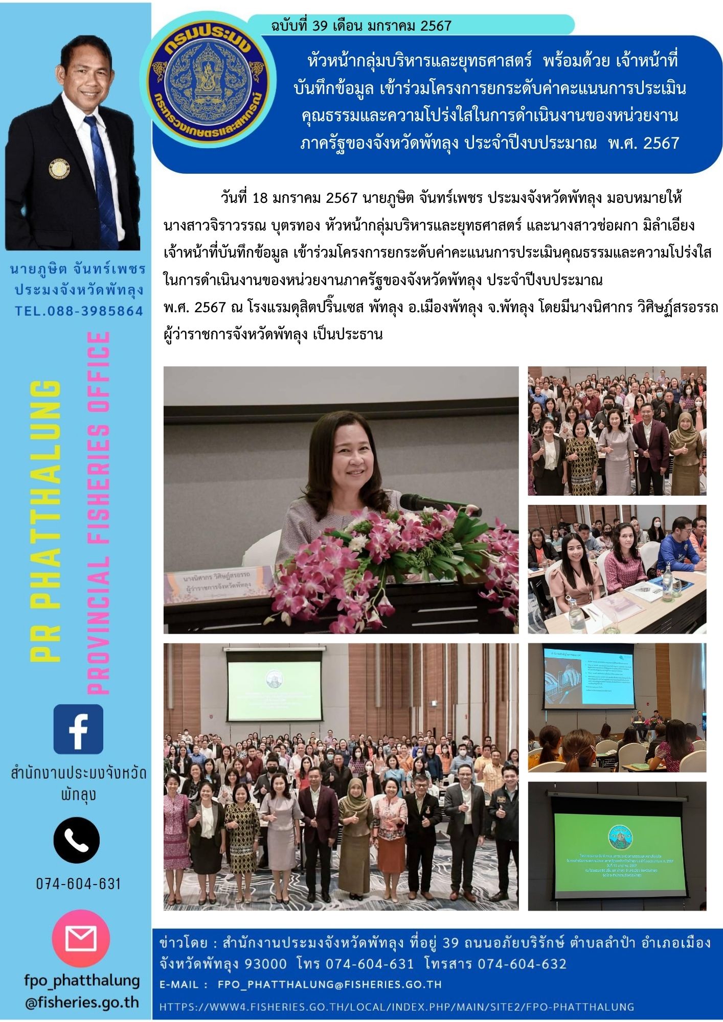วันที่ 18 มกราคม 2567 นายภูษิต จันทร์เพชร ประมงจังหวัดพัทลุง มอบหมายให้ นางสาวจิราวรรณ บุตรทอง หัวหน้ากลุ่มบริหารและยุทธศาสตร์ และนางสาวช่อผกา มิลำเอียง เจ้าหน้าที่บันทึกข้อมูล เข้าร่วมโครงการยกระดับค่าคะแนนการประเมินคุณธรรมและความโปร่งใสในการดำเนินงานของหน่วยงานภาครัฐของจังหวัดพัทลุง ประจำปีงบประมาณพ.ศ. 2567