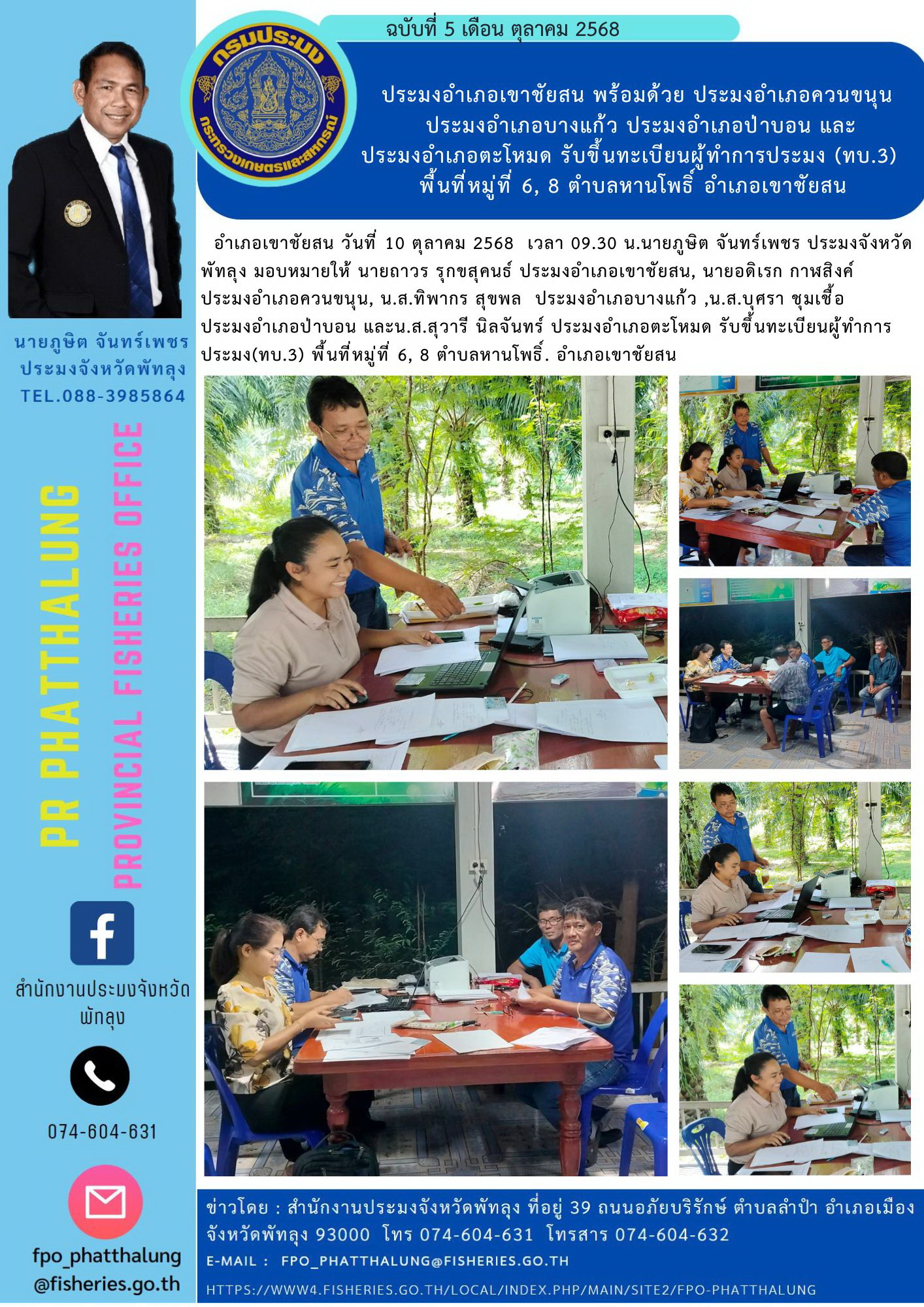 อำเภอเขาชัยสน วันที่ 10 ตุลาคม 2568 เวลา 09.30 น.นายภูษิต จันทร์เพชร ประมงจังหวัดพัทลุง มอบหมายให้ นายถาวร รุกขสุคนธ์ ประมงอำเภอเขาชัยสน, นายอดิเรก กาฬสิงห์ ประมงอำเภอควนขนุน, น.ส.ทิพากร สุขพล ประมงอำเภอบางแก้ว ,น.ส.บุศรา ชุมเชื้อ ประมงอำเภอป่าบอน และน.ส.สุวารี นิลจันทร์ ประมงอำเภอตะโหมด รับขึ้นทะเบียนผู้ทำการประมง(ทบ.3) พื้นที่หมู่ที่ 6, 8 ตำบลหานโพธิ์. อำเภอเขาชัยสน