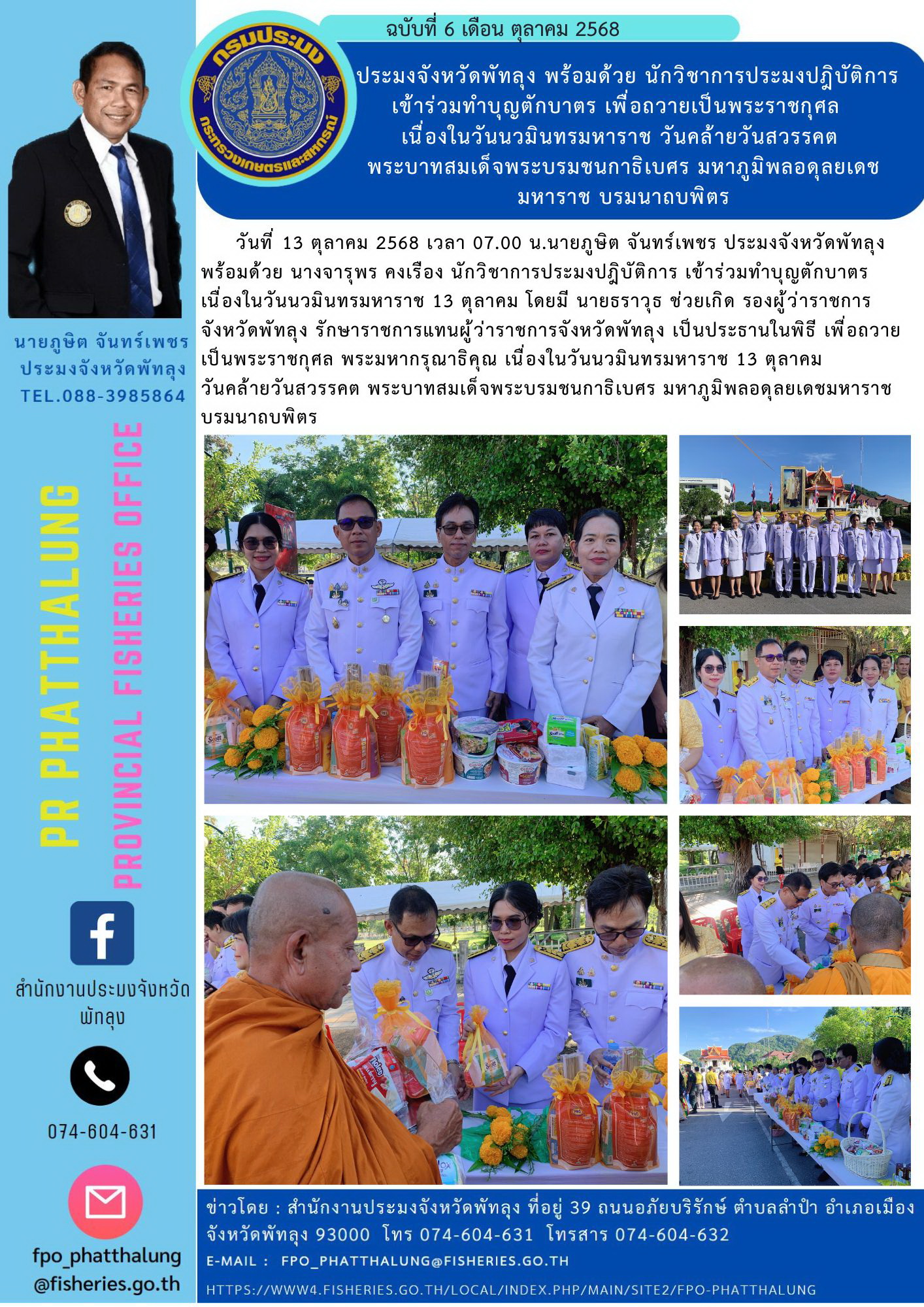 วันที่ 13 ตุลาคม 2568 เวลา 07.00 น.นายภูษิต จันทร์เพชร ประมงจังหวัดพัทลุง พร้อมด้วย นางจารุพร คงเรือง นักวิชาการประมงปฎิบัติการ เข้าร่วมทำบุญตักบาตร เนื่องในวันนวมินทรมหาราช 13 ตุลาคม โดยมี นายธราวุธ ช่วยเกิด รองผู้ว่าราชการจังหวัดพัทลุง รักษาราชการแทนผู้ว่าราชการจังหวัดพัทลุง เป็นประธานในพิธี เพื่อถวายเป็นพระราชกุศล พระมหากรุณาธิคุณ เนื่องในวันนวมินทรมหาราช 13 ตุลาคม วันคล้ายวันสวรรคต พระบาทสมเด็จพระบรมชนกาธิเบศร มหาภูมิพลอดุลยเดชมหาราช บรมนาถบพิตร