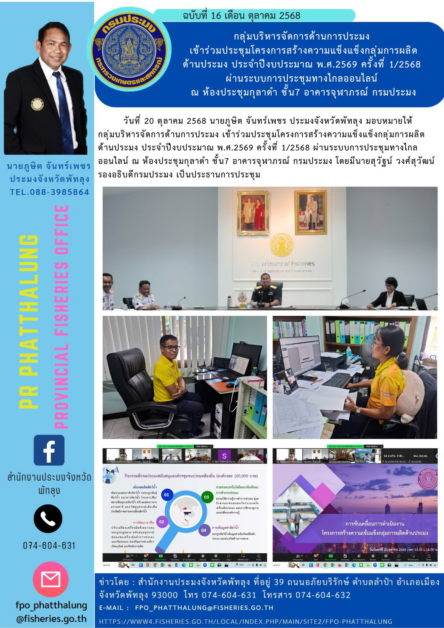 วันที่ 20 ตุลาคม 2568 นายภูษิต จันทร์เพชร ประมงจังหวัดพัทลุง มอบหมายให้ กลุ่มบริหารจัดการด้านการประมง เข้าร่วมประชุมโครงการสร้างความแข็งแข็งกลุ่มการผลิตด้านประมง ประจำปีงบประมาณ พ.ศ.2569 ครั้งที่ 1/2568 ผ่านระบบการประชุมทางไกลออนไลน์ ณ ห้องประชุมกุลาดำ ชั้น7 อาคารจุฬาภรณ์ กรมประมง โดยมีนายสุวัฐน์ วงศ์สุวัฒน์ รองอธิบดีกรมประมง เป็นประธานการประชุม