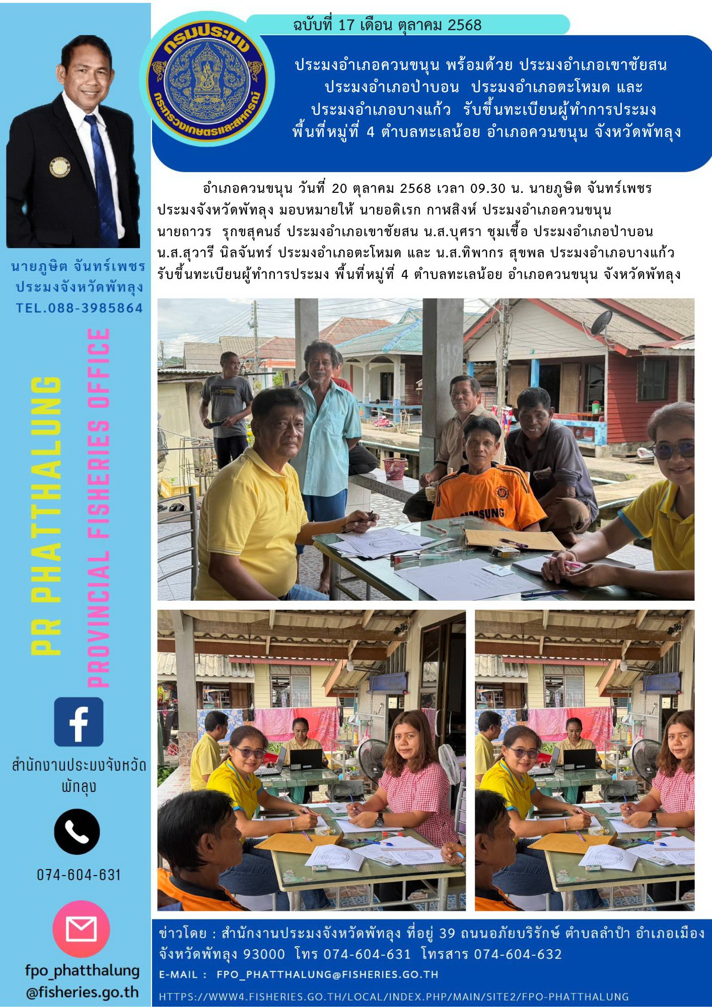 อำเภอควนขนุน วันที่ 20 ตุลาคม 2568 เวลา 09.30 น. นายภูษิต จันทร์เพชร ประมงจังหวัดพัทลุง มอบหมายให้ นายอดิเรก กาฬสิงห์ ประมงอำเภอควนขนุน นายถาวร รุกขสุคนธ์ ประมงอำเภอเขาชัยสน น.ส.บุศรา ชุมเชื้อ ประมงอำเภอป่าบอน น.ส.สุวารี นิลจันทร์ ประมงอำเภอตะโหมด และ น.ส.ทิพากร สุขพล ประมงอำเภอบางแก้ว รับขึ้นทะเบียนผู้ทำการประมง พื้นที่หมู่ที่ 4 ตำบลทะเลน้อย อำเภอควนขนุน จังหวัดพัทลุง