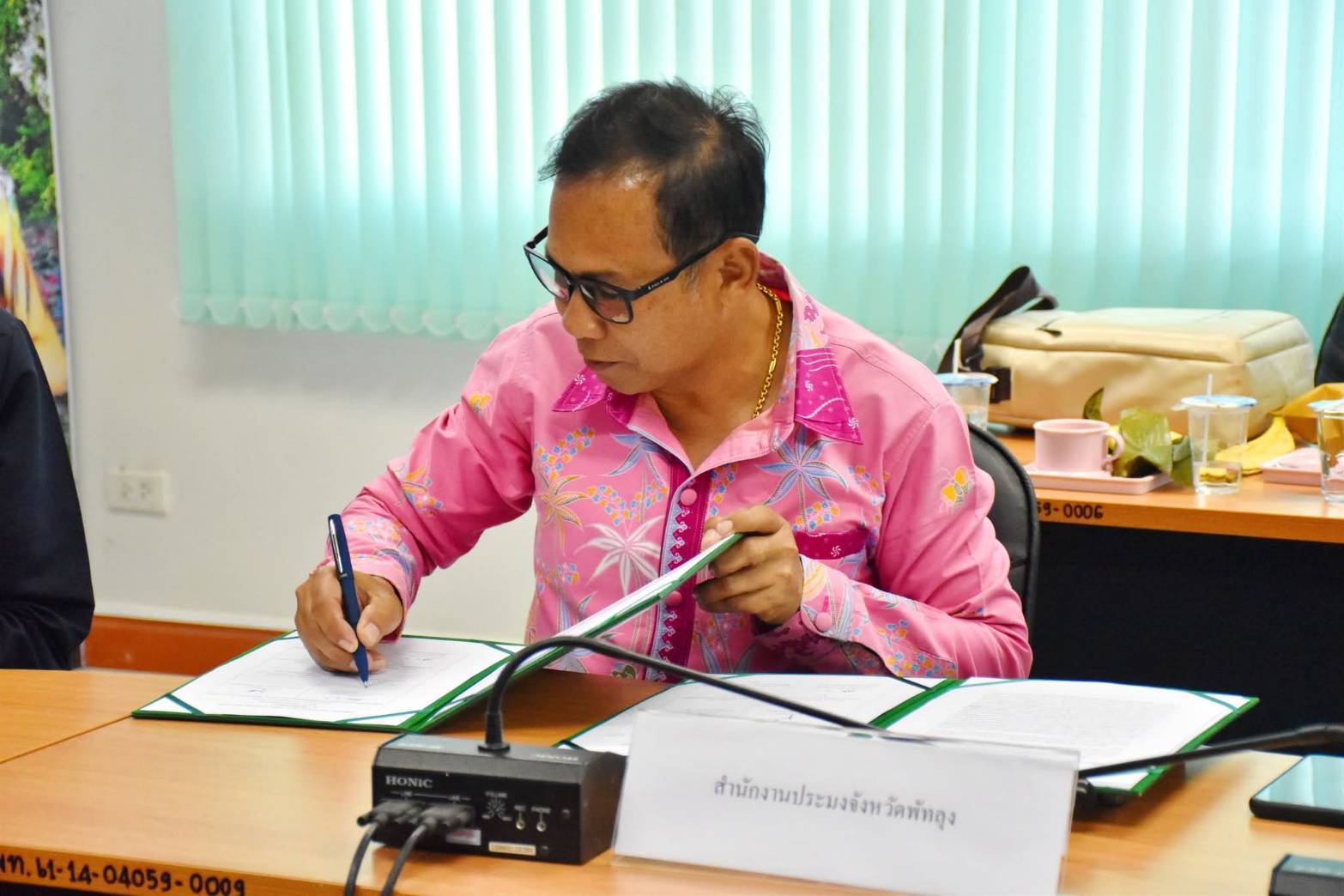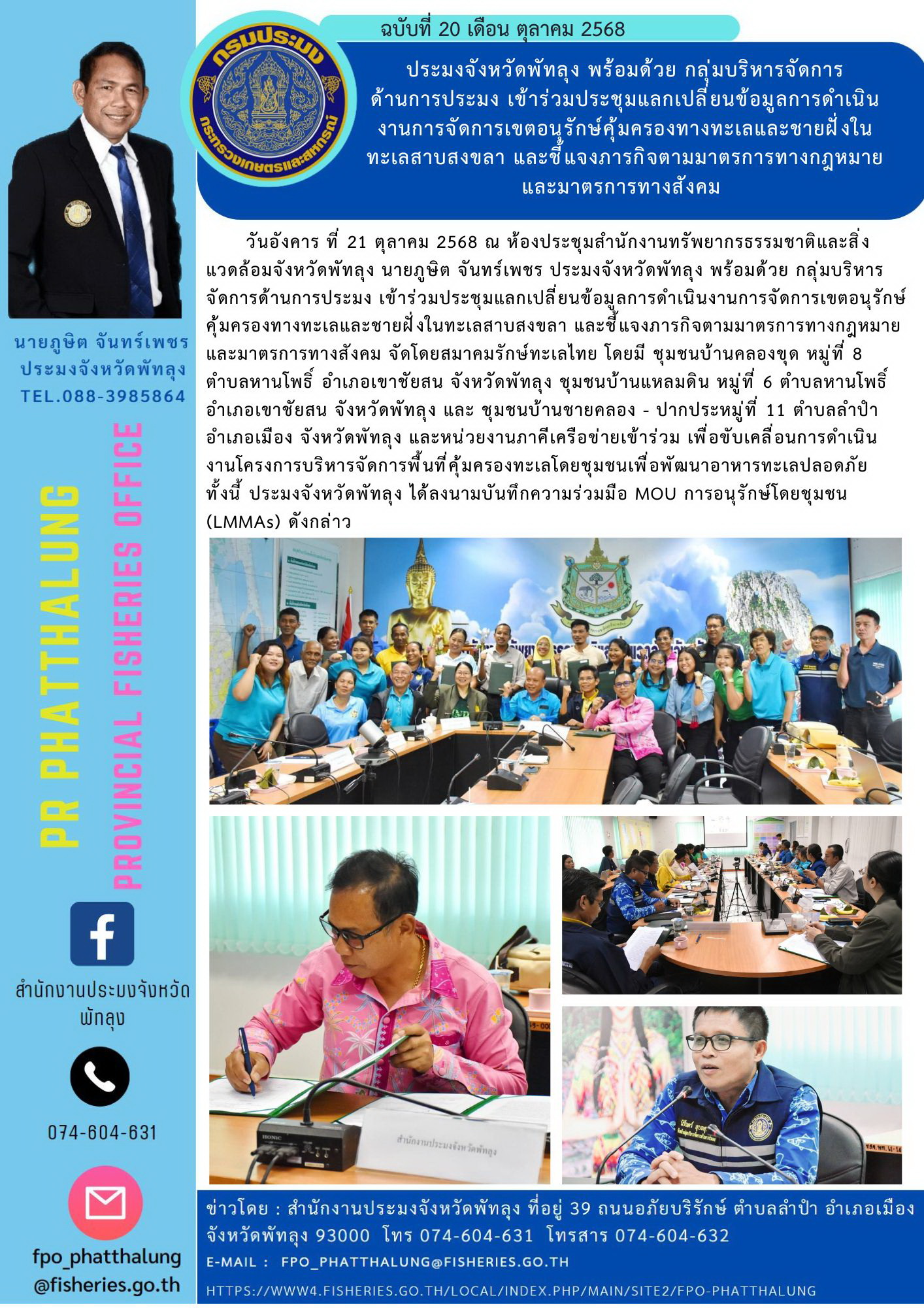วันอังคาร ที่ 21 ตุลาคม 2568 ณ ห้องประชุมสำนักงานทรัพยากรธรรมชาติและสิ่งแวดล้อมจังหวัดพัทลุง นายภูษิต จันทร์เพชร ประมงจังหวัดพัทลุง พร้อมด้วย กลุ่มบริหารจัดการด้านการประมง เข้าร่วมประชุมแลกเปลี่ยนข้อมูลการดำเนินงานการจัดการเขตอนุรักษ์คุ้มครองทางทะเลและชายฝั่งในทะเลสาบสงขลา และชี้แจงภารกิจตามมาตรการทางกฎหมาย และมาตรการทางสังคม จัดโดยสมาคมรักษ์ทะเลไทย โดยมี ชุมชนบ้านคลองขุด หมู่ที่ 8 ตำบลหานโพธิ์ อำเภอเขาชัยสน จังหวัดพัทลุง ชุมชนบ้านแหลมดิน หมู่ที่ 6 ตำบลหานโพธิ์ อำเภอเขาชัยสน จังหวัดพัทลุง และ ชุมชนบ้านชายคลอง - ปากประหมู่ที่ 11 ตำบลลำปำ อำเภอเมือง จังหวัดพัทลุง และหน่วยงานภาคีเครือข่ายเข้าร่วม เพื่อขับเคลื่อนการดำเนินงานโครงการบริหารจัดการพื้นที่คุ้มครองทะเลโดยชุมชนเพื่อพัฒนาอาหารทะเลปลอดภัย ทั้งนี้ ประมงจังหวัดพัทลุง ได้ลงนามบันทึกความร่วมมือ MOU การอนุรักษ์โดยชุมชน (LMMAs) ดังกล่าว