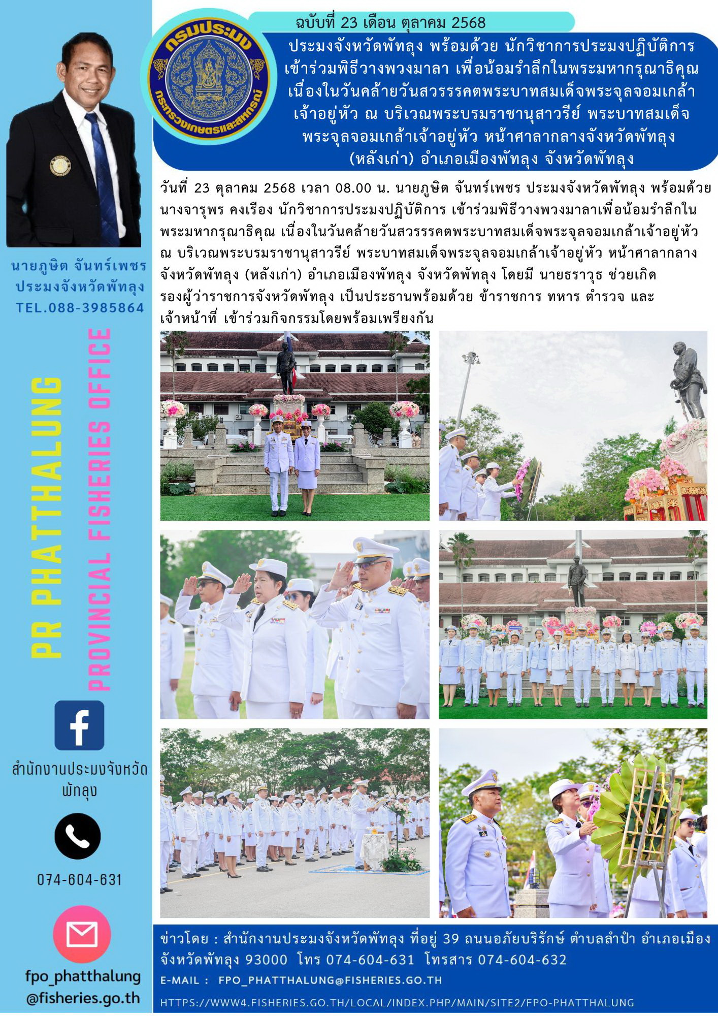 วันที่ 23 ตุลาคม 2568 เวลา 08.00 น. นายภูษิต จันทร์เพชร ประมงจังหวัดพัทลุง พร้อมด้วยนางจารุพร คงเรือง นักวิชาการประมงปฏิบัติการ เข้าร่วมพิธีวางพวงมาลาเพื่อน้อมรำลึกในพระมหากรุณาธิคุณ เนื่องในวันคล้ายวันสวรรรคตพระบาทสมเด็จพระจุลจอมเกล้าเจ้าอยู่หัว ณ บริเวณพระบรมราชานุสาวรีย์ พระบาทสมเด็จพระจุลจอมเกล้าเจ้าอยู่หัว หน้าศาลากลางจังหวัดพัทลุง (หลังเก่า) อำเภอเมืองพัทลุง จังหวัดพัทลุง โดยมี นายธราวุธ ช่วยเกิด รองผู้ว่าราชการจังหวัดพัทลุง เป็นประธานพร้อมด้วย ข้าราชการ ทหาร ตำรวจ และเจ้าหน้าที่ เข้าร่วมกิจกรรมโดยพร้อมเพรียงกัน