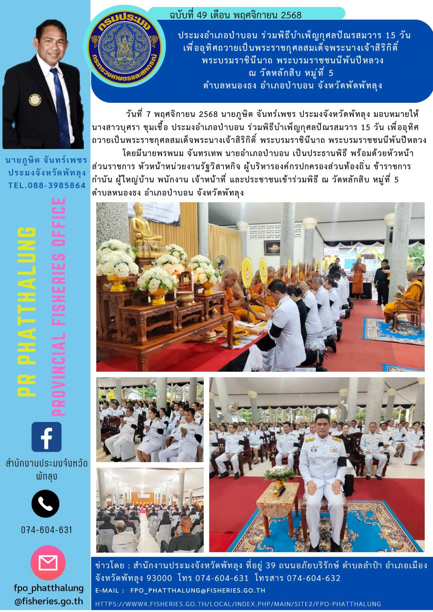 วันที่ 7 พฤศจิกายน 2568 นายภูษิต จันทร์เพชร ประมงจังหวัดพัทลุง มอบหมายให้นางสาวบุศรา ชุมเชื้อ ประมงอำเภอป่าบอน ร่วมพิธีบำเพ็ญกุศลปัณรสมวาร 15 วัน เพื่ออุทิศถวายเป็นพระราชกุศลสมเด็จพระนางเจ้าสิริกิติ์ พระบรมราชินีนาถ พระบรมราชชนนีพันปีหลวง โดยมีนายพรพนม จันทรเทพ นายอำเภอป่าบอน เป็นประธานพิธี พร้อมด้วยหัวหน้าส่วนราชการ หัวหน้าหน่วยงานรัฐวิสาหกิจ ผู้บริหารองค์กรปกครองส่วนท้องถิ่น ข้าราชการ กำนัน ผู้ใหญ่บ้าน พนักงาน เจ้าหน้าที่ และประชาชนเข้าร่วมพิธี ณ วัดหลักสิบ หมู่ที่ 5 ตำบลหนองธง อำเภอป่าบอน จังหวัดพัทลุง